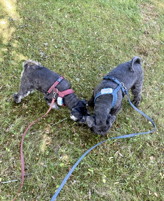 Sen åkte vi till kiosken och där bjöd Wilma alla hundar på en bägare vaniljglass. Hon firar sin hemflyttningsdag och det är en viktig dag i hundarnas liv. ’