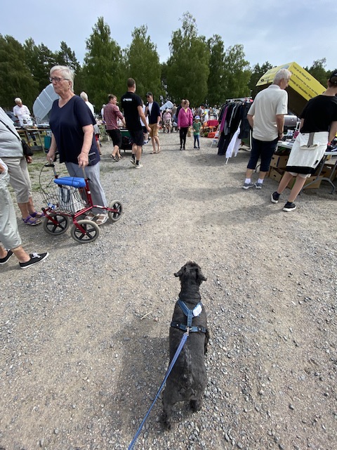 Mycket folk på loppisen. Alltså flytta på er för här kommer jag sa Troy. Matte fyndade en sådär Tupperware plastbytta som hon inte verkar få nog av. Den är tydligen bra för att tina räkor i. Så okay då, för räkor är gott. Gott sa Troy.