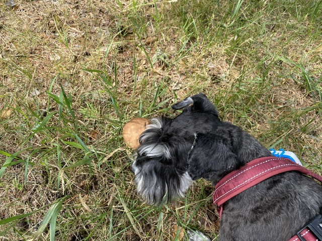 Å så kom vi till Troys stubbe. Han markerade men det fanns inte några föränderliga tofsskivlingar där. Men han stod envist kvar och slicka sig om nosen så Helena gick fram för att titta efter vad det var han markerade på. Helena berömde honom mycket och så fick han smaka på osttuben. För om man tittade noga fanns det ju svamp där om än väldigt små nästan som knappnålshuvuden.