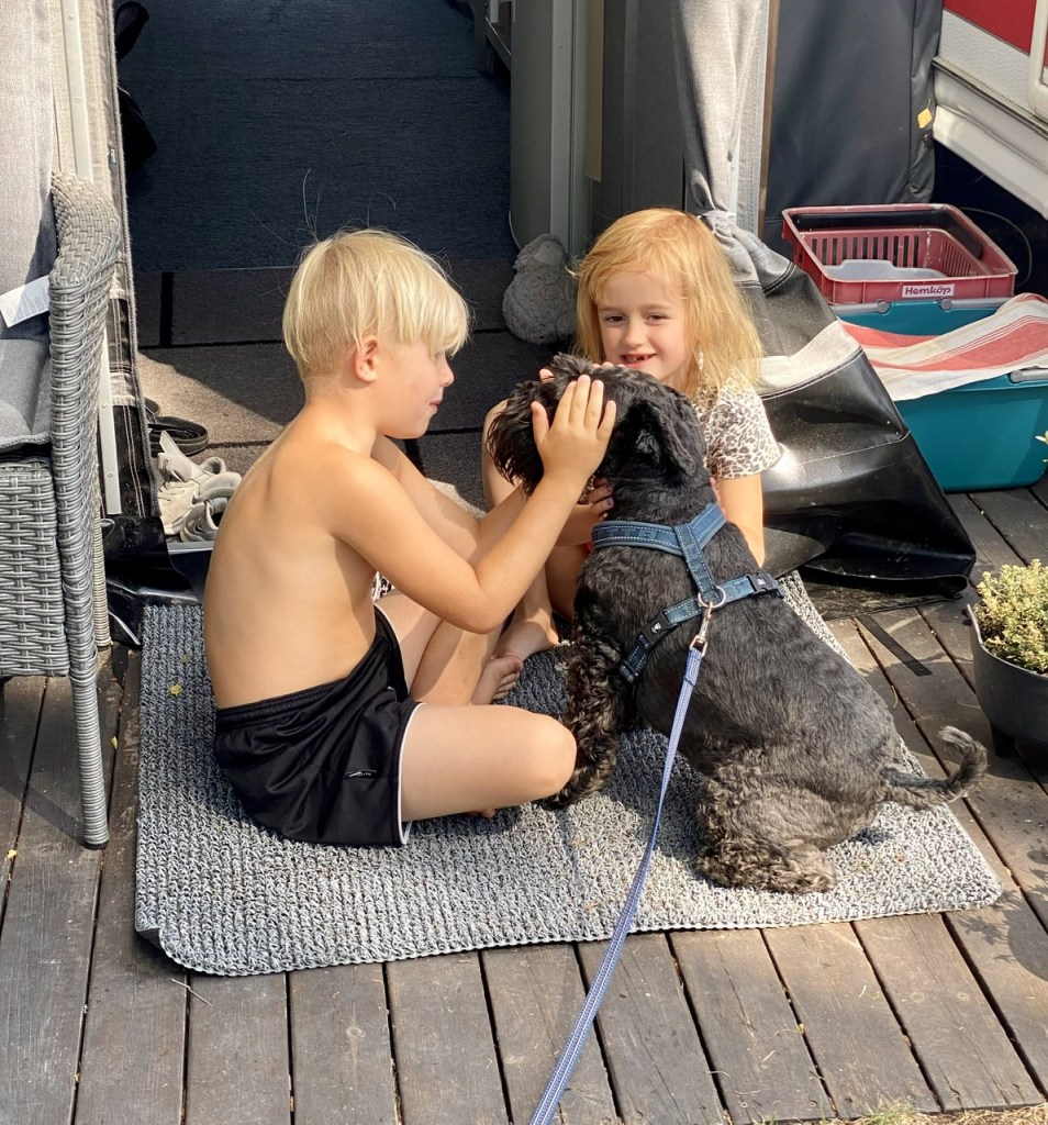 Några av barnen på campingen har lärt känna oss. Troy är jätteförsiktig med dem och gillar verkligen att gosa. Lukas och Ronja tillhör favoriterna hos dem kan han sitta länge.