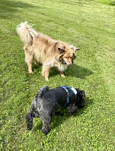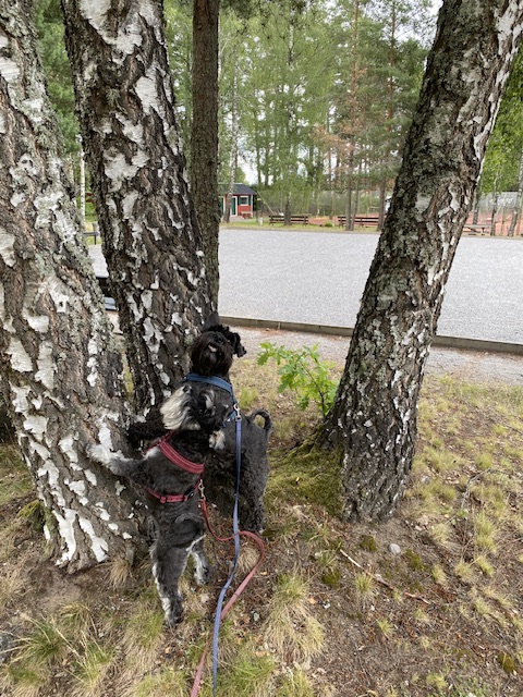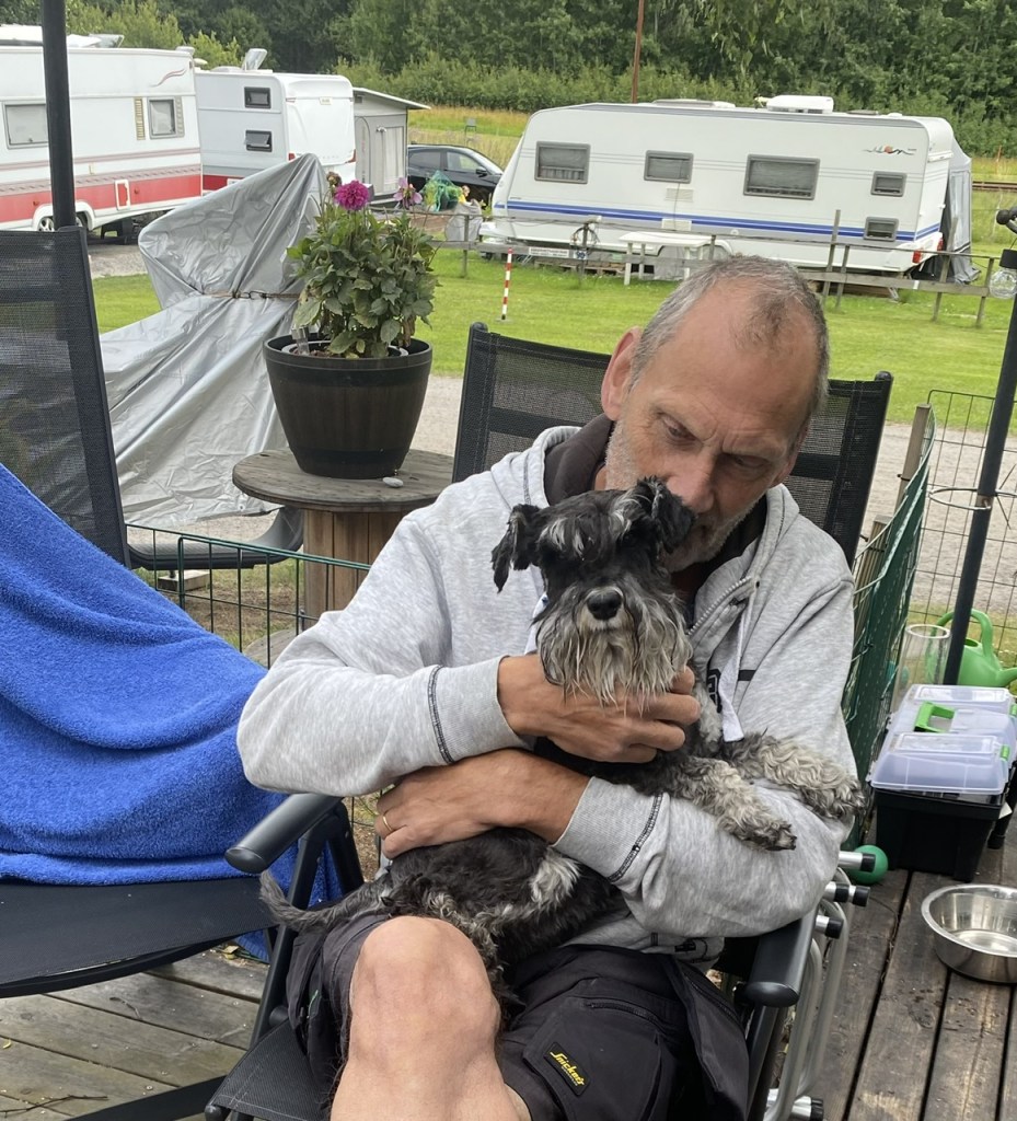 Det hålls på och fixas med en markis. Då väsnas det en del och när det blir en paus i jobbet sätter jag mig hos vår granne Nisse. Han vet hur man gosar med en vovve.