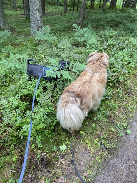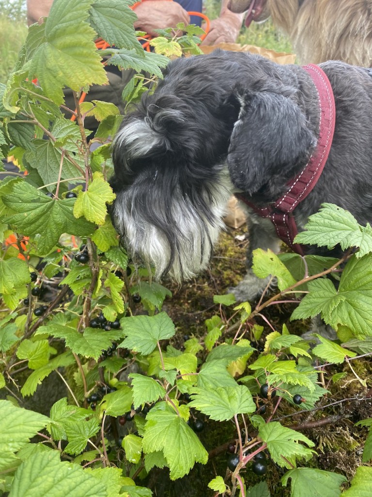 Mattarna plockar svarta vinbär och jag undrar om de är goda. Du får plocka själv säger matte när jag försöker tigga. Nå ja jag får väl det då. Wow de är ju jättegoda ju varför har du inte visat dem förut. Knasmatte plockar blad, vad skall hon med dem till?