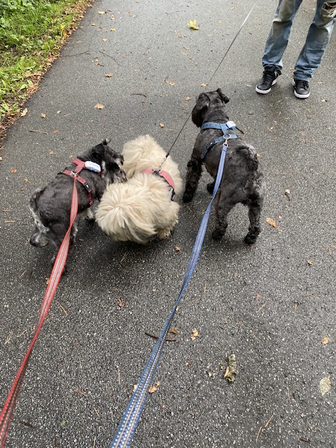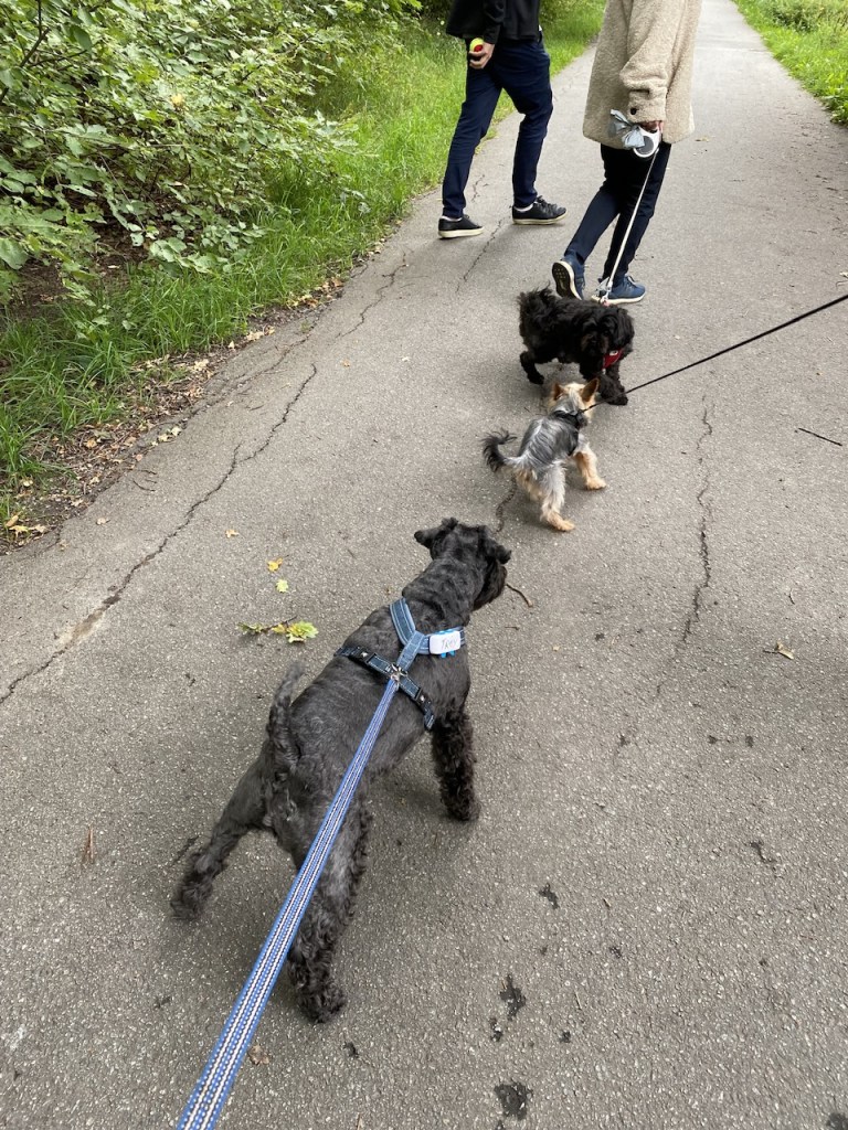 Vi möter Morris och det blir en stor hälsningsceremoni för det var länge sen. Sen kom det en annan hund vi inte känner och Troy intog försvarsställning och bevakade när Morris gick fram för att hälsa.