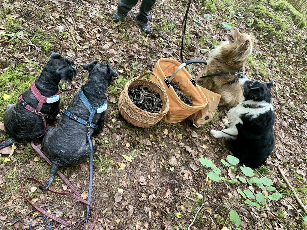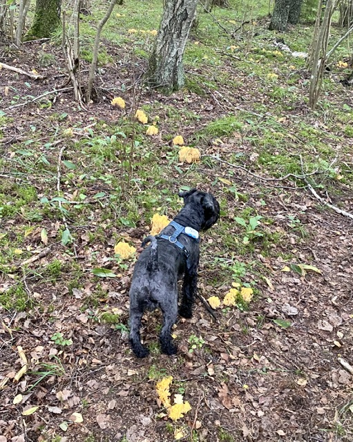 Äntligen tillbaka till skogen. Mattarna tycker att det är väldigt mycket svamp. Det är bra för då blir det många slick på osttuben. Troy hittade massor av fingersvamp men de gav ingen mjukost.