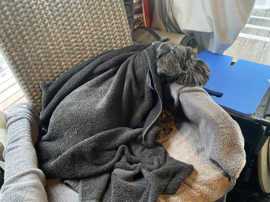 Inte han vi till bilarna innan det började regna ordentligt. Vi tyckte det var härligt att komma till vagnen där det var torrt och varmt. Troy var lite frusen så han knorrade av välmående när han fick en handduk som filt på sig. Men man kan inte missa vakten av campingen för det.