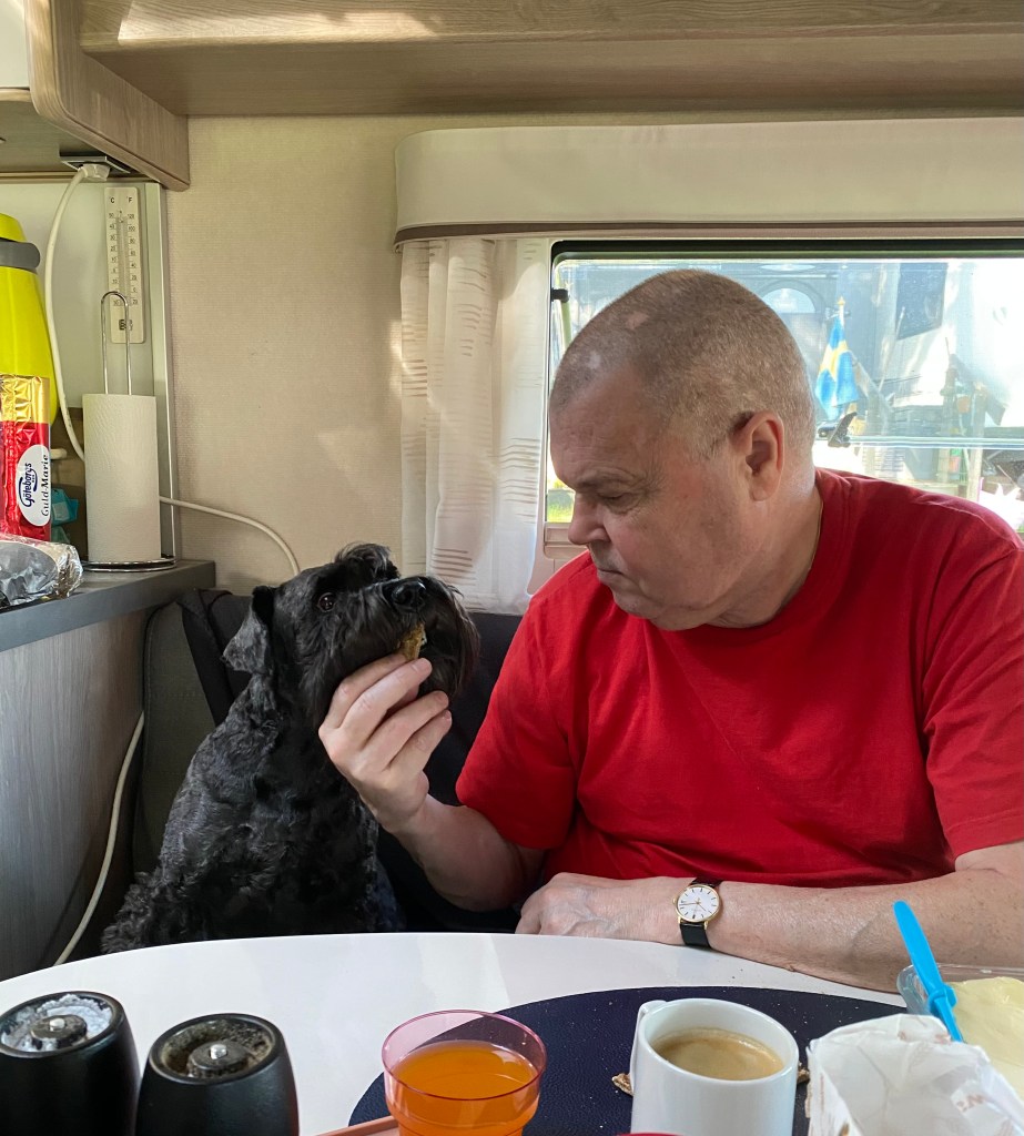 Konsten att tigga till sig slumpen av husses macka är något Troy behärskar till fullo. I husvagnen sitter man perfekt för det i soffan. Det gäller att sitta fint och att ha ett gott bordsskick, inga tassar eller nosen på bordet, sen skall man ta fint också. Men vad gör man inte för slumpen av en knäckebrödsmacka.