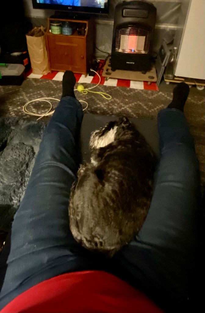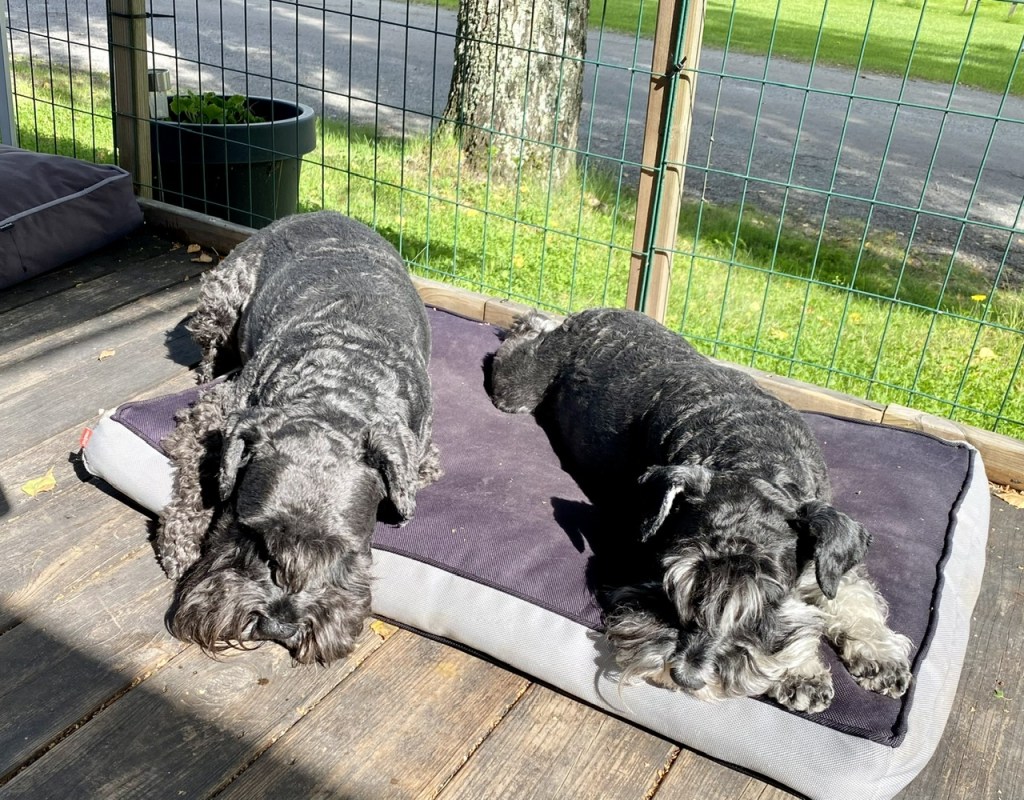 När eftermiddagsfikat är avnjutet vilar vi framför kaminen. Matte fixar med en massa svamp som skall i svamptorken. Det är körigt att vara människa, en massa måsten.