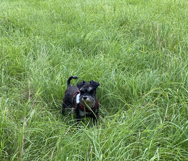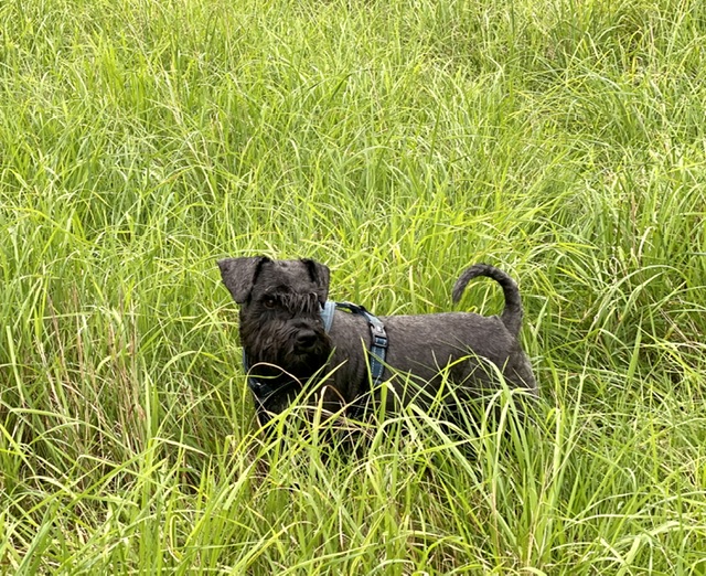 Sen ut på ängen och kolla för här finns åkersork och Troy lyssnar efter dem. En lunchsork vore smaskens.