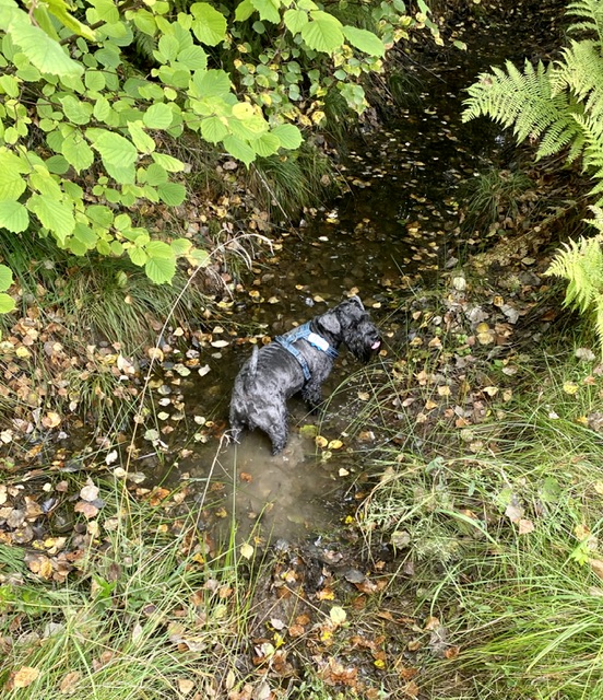 Troy och Basse var överlyckliga över att det fortfarande finns vatten i diket. Dikesvatten är gott fast matte tycker att det stinker av dy. Troy kan inte nöja sig med att dricka han måste prompt i och plaska.