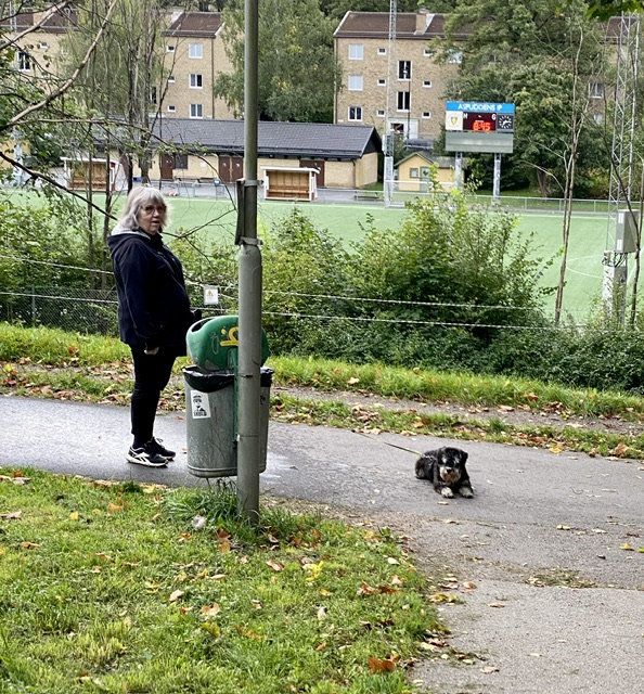 Hemma i stan igen och på morgonturen träffade vi Balder. Han såg oss på långt håll och vägrade att gå vidare. Det är väldigt underligt att en snuzze kan förvandlas till en cementsäck helt omöjlig att flytta på.
