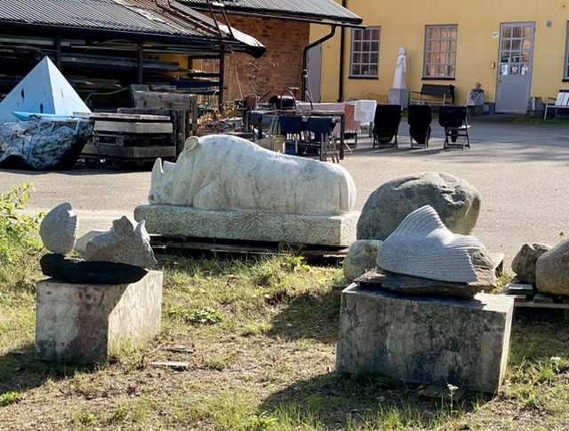 Vid skulpturens hus har det kommit lite nya saker sen vi var här sist. Kolla va, det var en bjässe till noshörning och någon konstig sorts fisk.