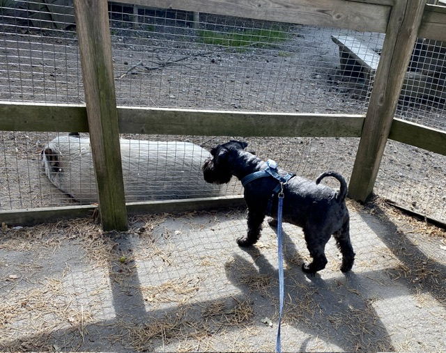 Men lilla vän sa matte de där fåren och getterna har inga laserpistoler, du satte nosen mot elstängslet förra gången. Du luras sa Troy och efter lite övertalning följde han med stor tveksamhet med. Han gick tätt intill matte. Inget hände men han är inte helt övertygad om att de inte har laserpickor.