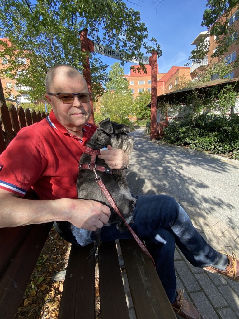 När vi kom hem satt husse och väntade på oss. Jag hoppade upp i hans knä sen satt vi där och spanade på alla som kom och gick.