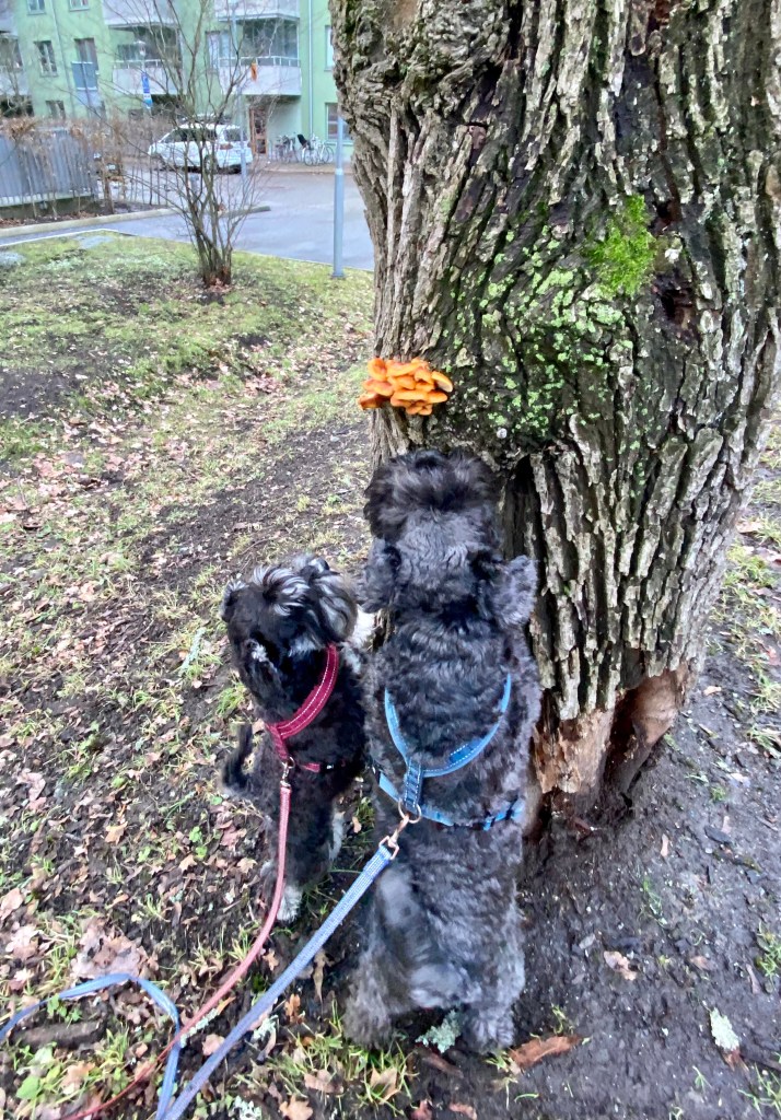 Kolla matte kolla! Det växer svampar på trädet. Helena säger att det är vinterskivling. Ingen osttub med säger du men då får du skärpa till dig och ta med den. För när vi hittar sådana svampar skall det belönas och då duger inget annat än mjukost.