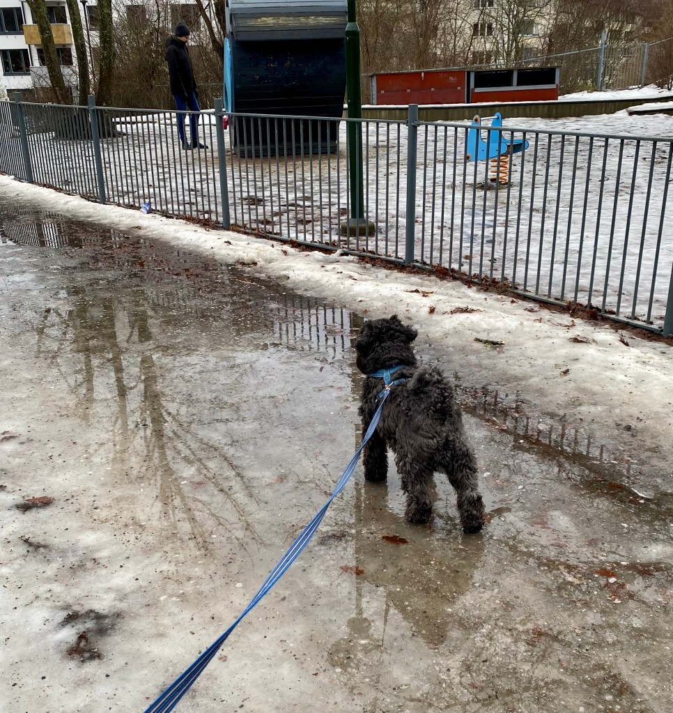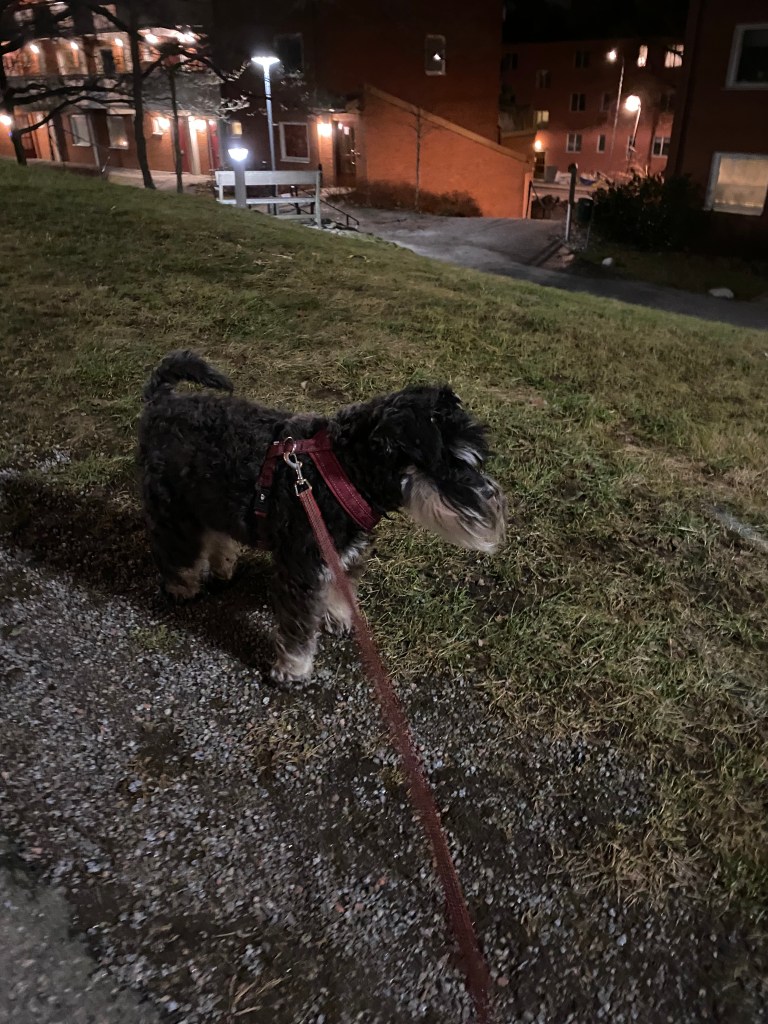 Det blåser utav tusan, matte säger att det är flyg med liten hund. Tur att rundan för nattpink är kort.