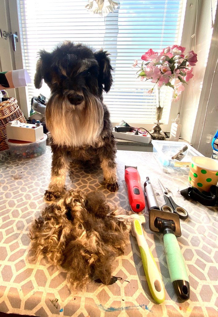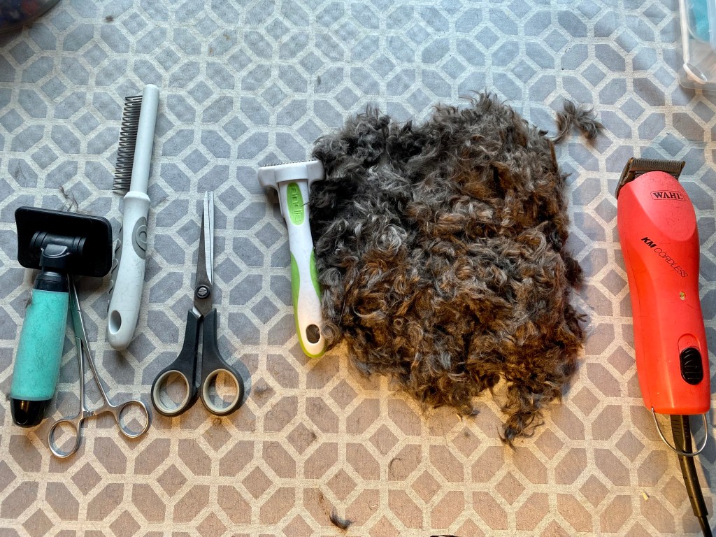 Så då åkte jag dit, upp på trimbordet för frisering av benhår samt lite ullkamning. Mycket hår på benen var det. Fortsättning följer.