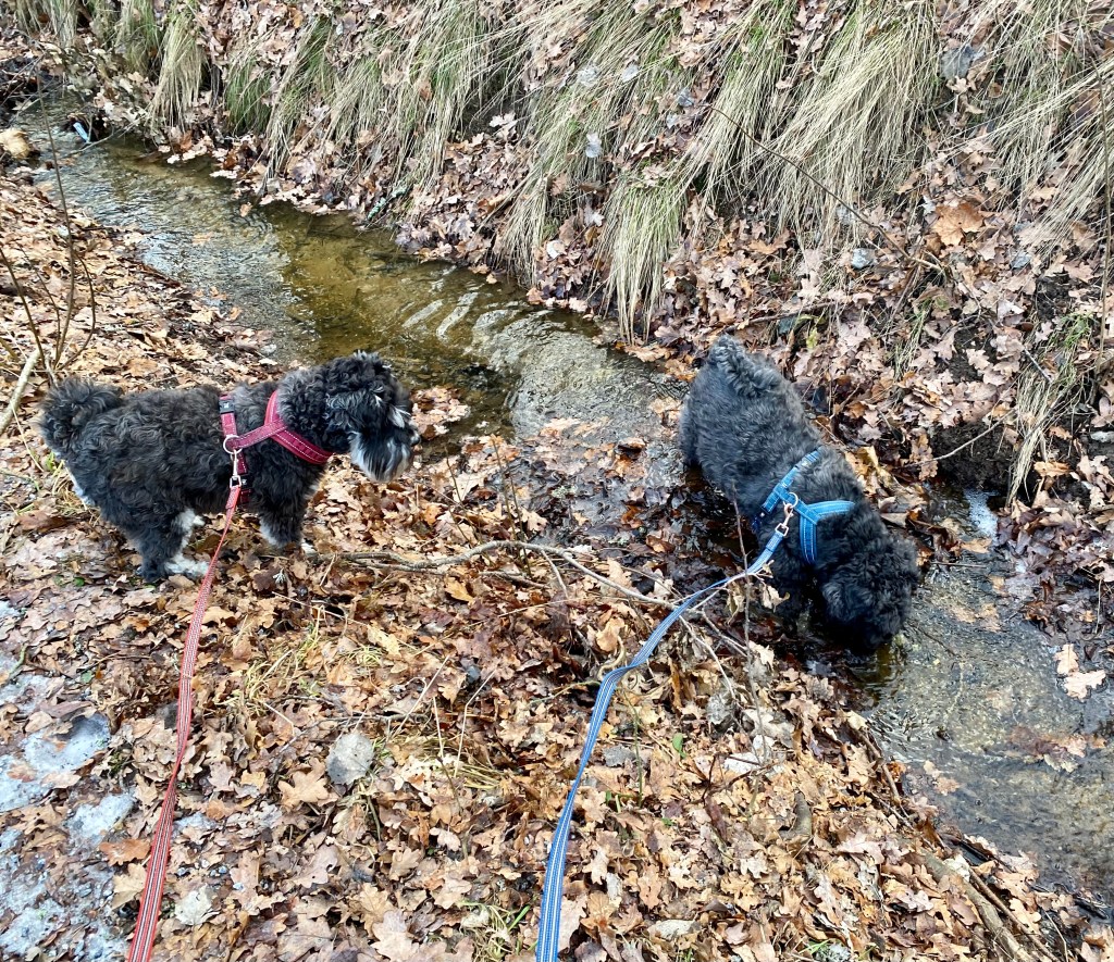 NU ÄR DET VÅR! Kom inte och påstå något annat för det porlar vatten i diket. Troy bara rusade dit. Vi tycker att dikesvattnet är väldigt gott men jag går inte i för det går att dricka utan att blöta ned sig.
