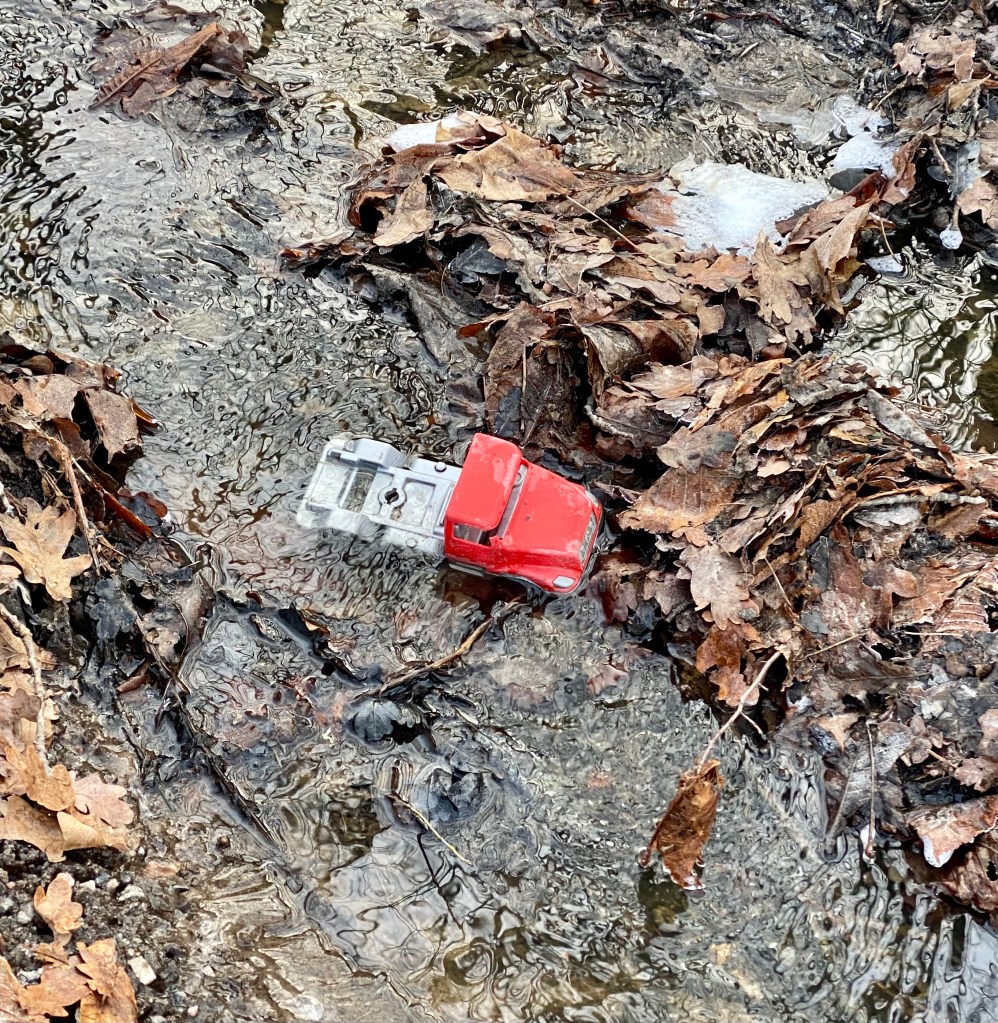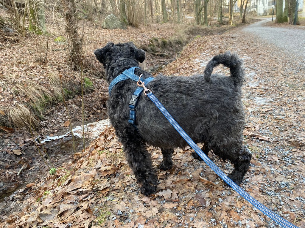 Troy plaskade i och det var djupare än vad vi trodde, halva bakkärran sjönk ned och han hade svårt att komma upp. Matte fick kliva ned i dikeskanten och lyfta upp honom.
