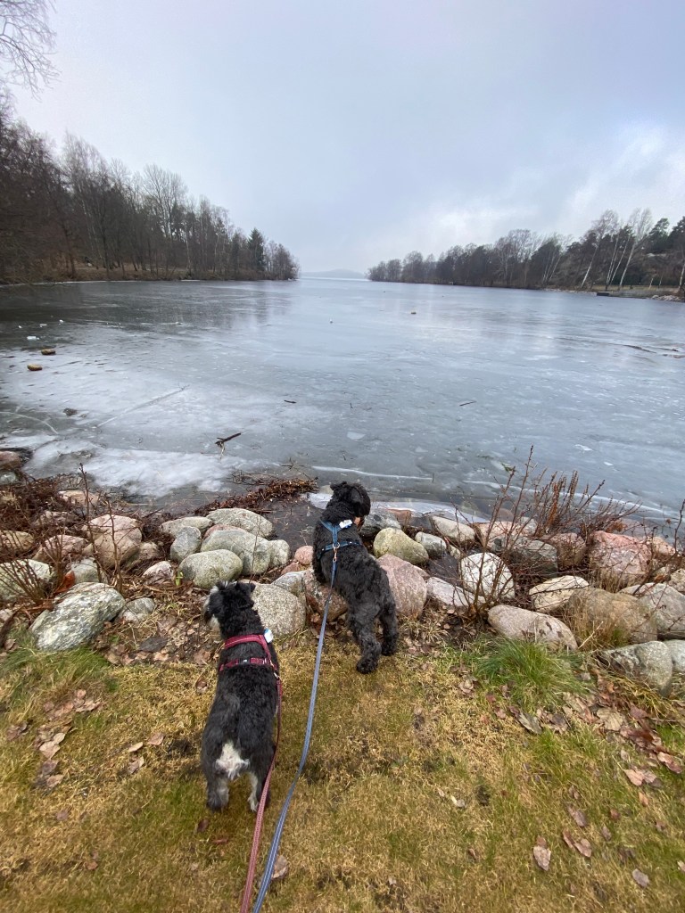 Det var gråväder på vår tur runt Vinterviken. Vi spanar in isläget i viken och det är fortfarande ganska tjock is.