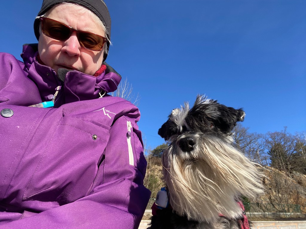 Matte visst är det skönt här i solen, vi tar en selfi tycker jag. Vi sitter på en bänk som står i lä och kollar på alla som går förbi. På båtklubben är det ännu lite dött men aktiviteter kommer nog igång när det blir dags för sjösättning.
