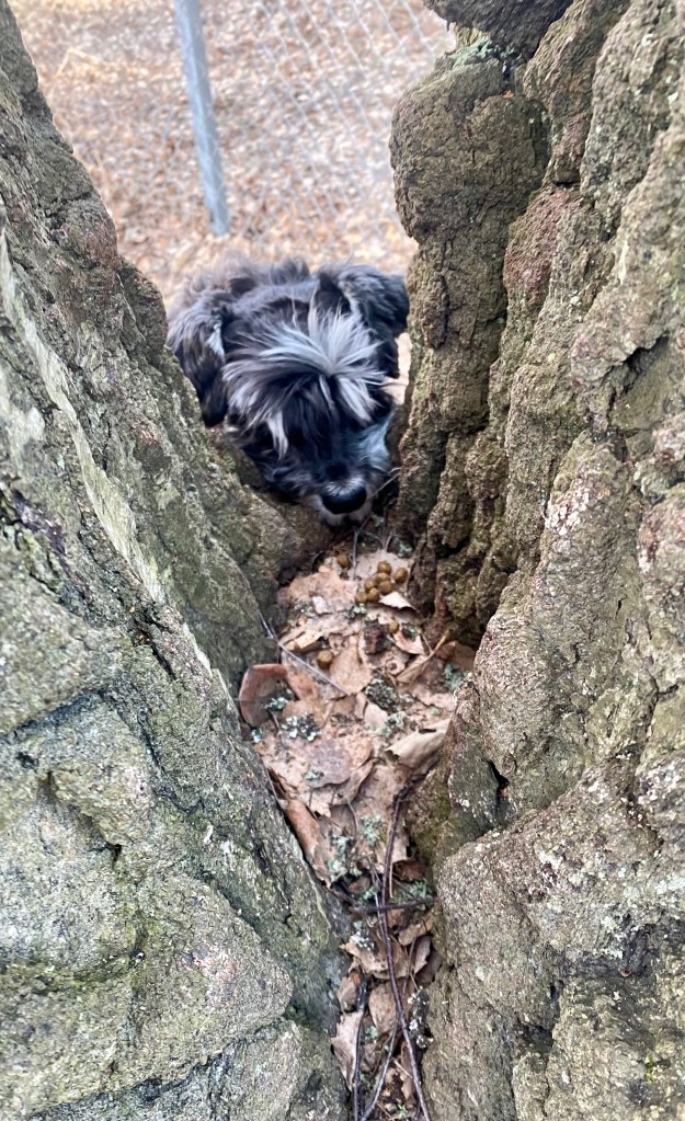 Men vad är det här? Min nos sa mig att det skulle finnas godis här uppe. Det är två björkar dom är sammanväxta nedtill och sen delar de sig. Där i klykan ligger det godis, min nos sviker aldrig mig.