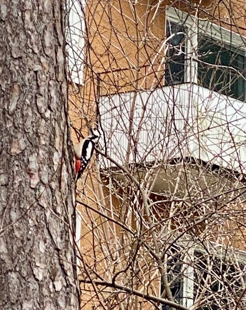 Den där pippin är inte klok. Den hackar i trädet så det flyger bark. Stor hackspett var det tydligen.