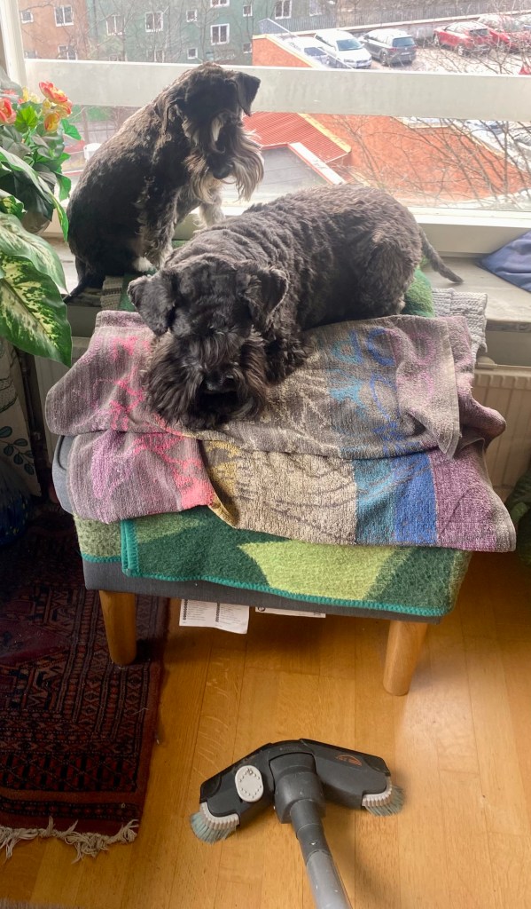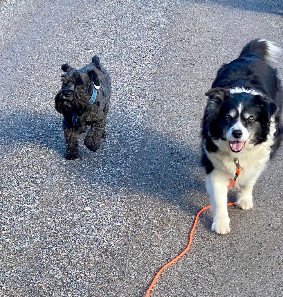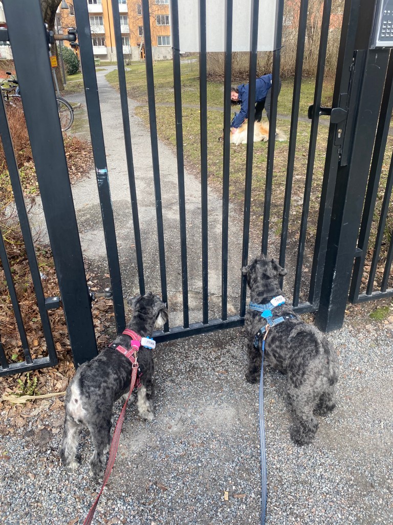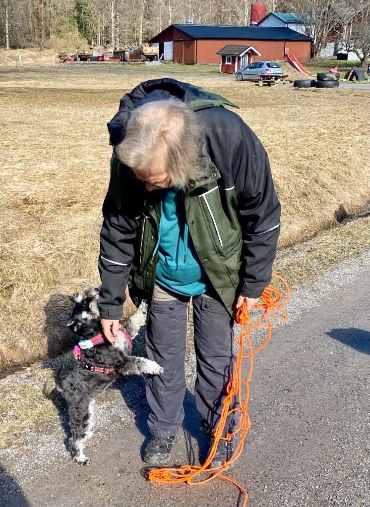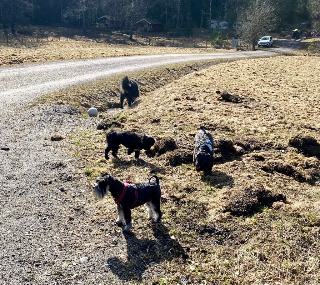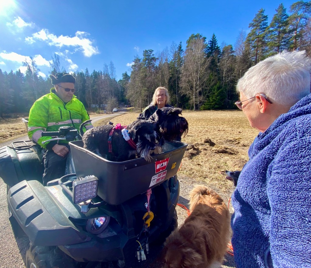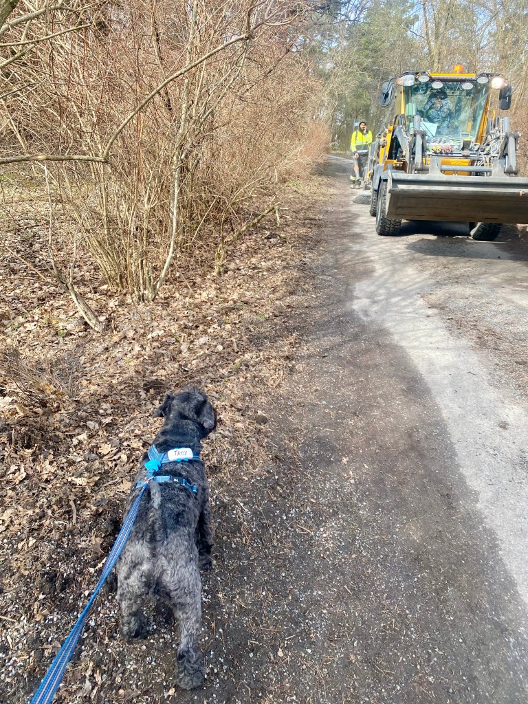 Nu tror jag att alla tvåbeningar har blivit tokiga. Mattes städdille smittar tydligen, här möter vi några som städar och det är ett fasligt liv. Men de är hyggliga människor för de stänger ned maskinernaså vi kan passera i lugn och ro.