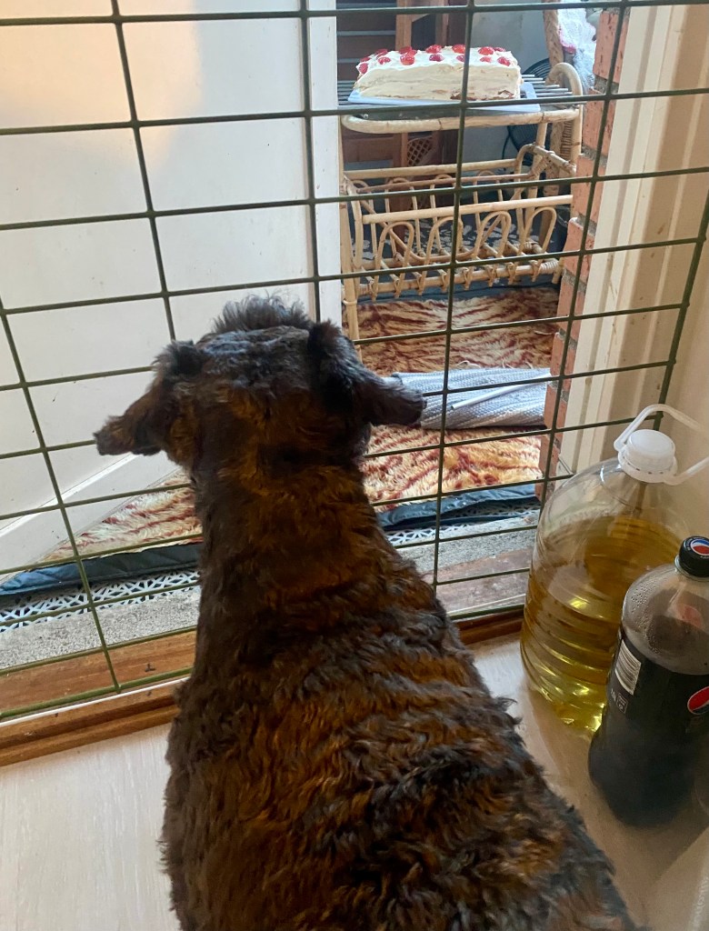 Alla vovvar fick varsin tallrik. Inget gruff bröt ut fast vi smakade lite på varandras tallrikar. Tvåbeningarna tyckte det var konstigt att pannkakorna gick först! Helena hade gjort dem särskilt för oss inget, socker eller salt och de smakade förträffligt.
