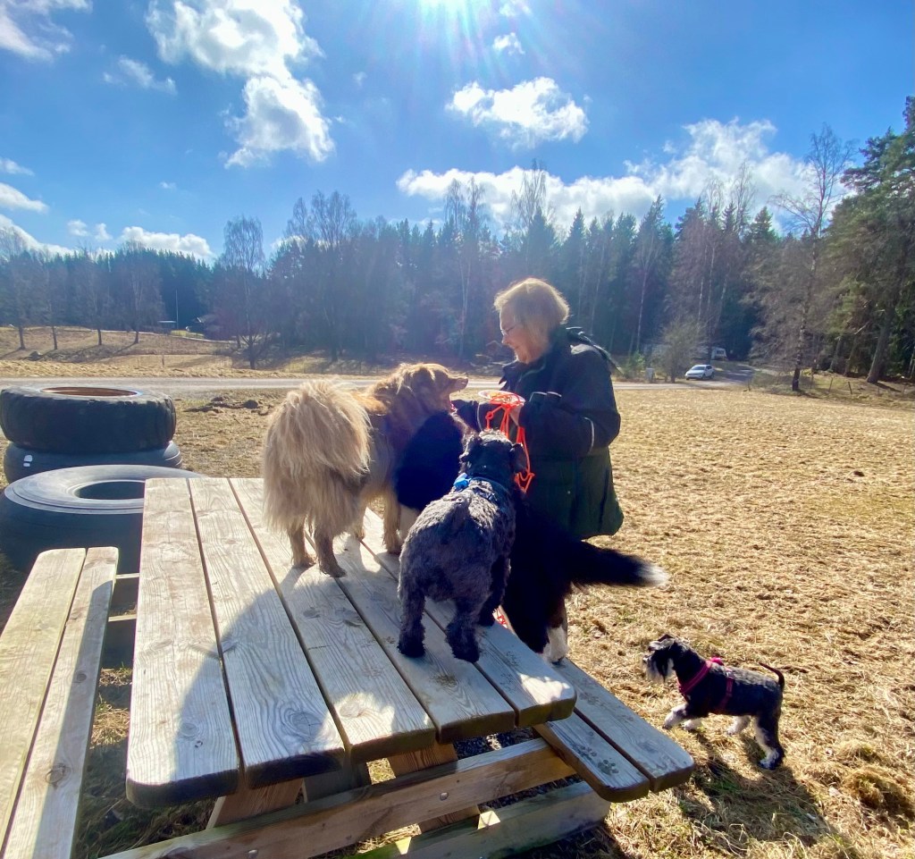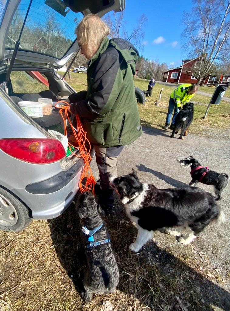 Det packas i väskor vilket gör att jag undrar vad som är på gång. Yippie vi skall till vagnen och nu när det är lördag skall vi på hundträffen. Jag mötte Helena och talade om för henne hur glad jag blev av att träffas. Vi har inte setts på jättelänge, flera år.