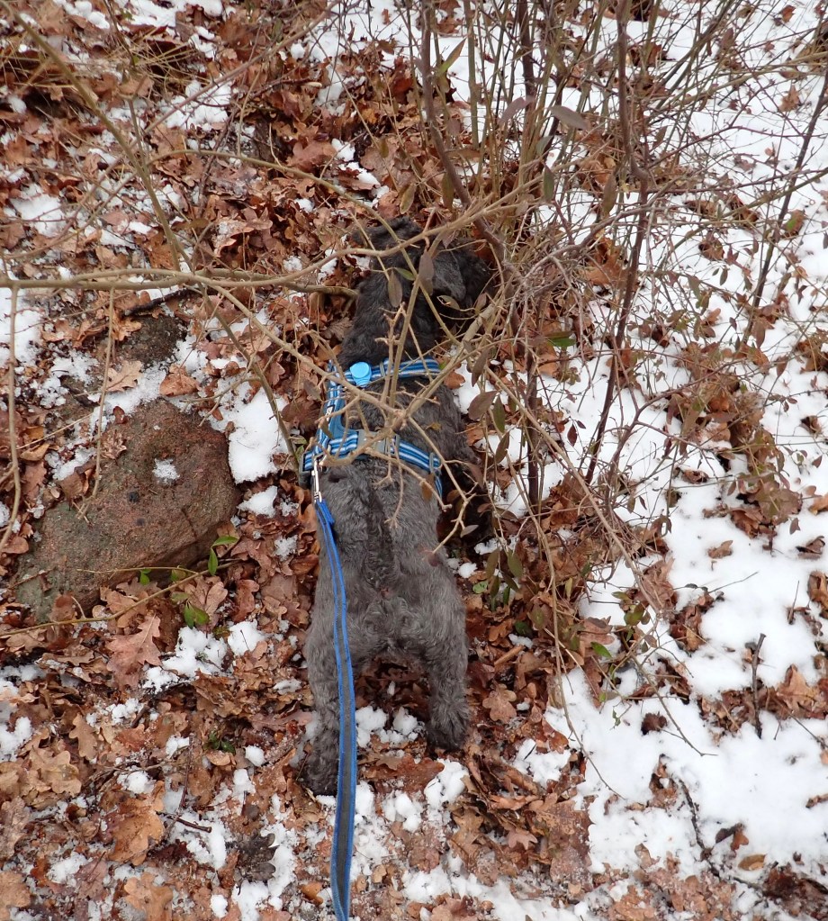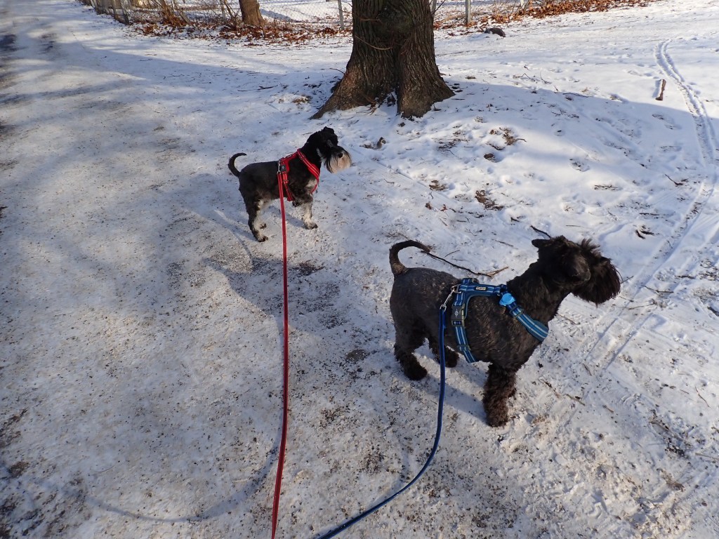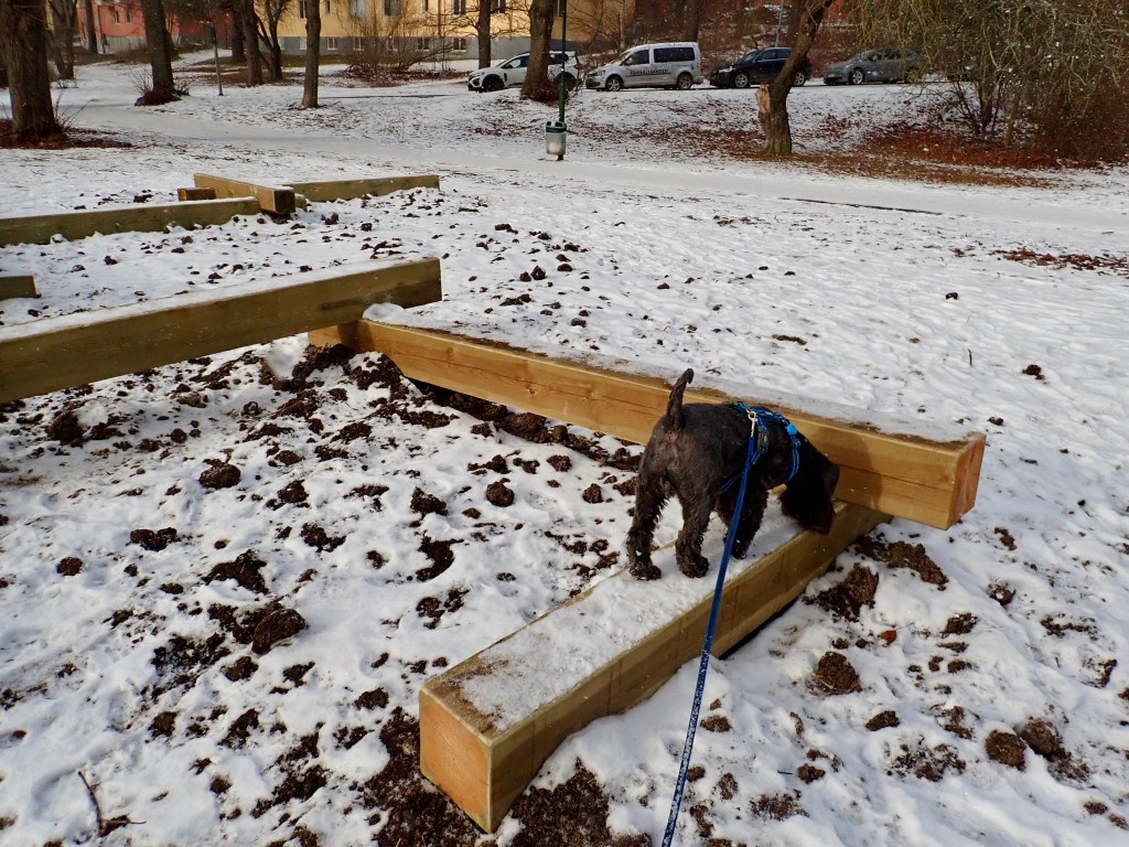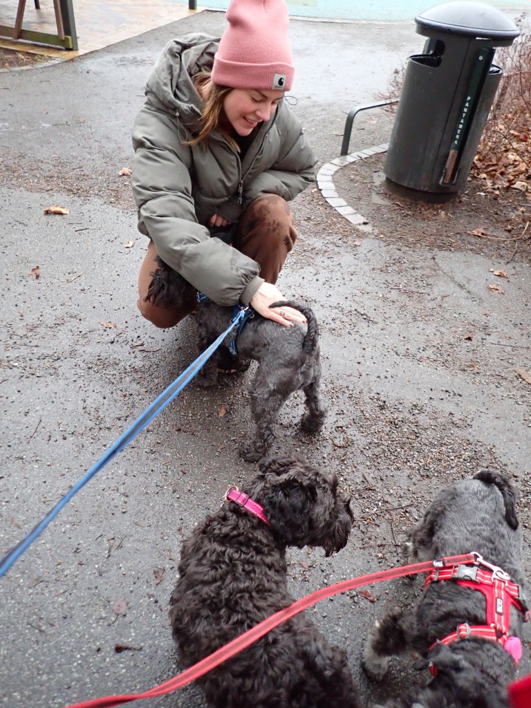 Vi mötte en svart snuzzetjej som vi hälsade vänligt på. Troy fjompar sig för hennes matte och det lönade sig. Matte glömde att fråga vad de hette.