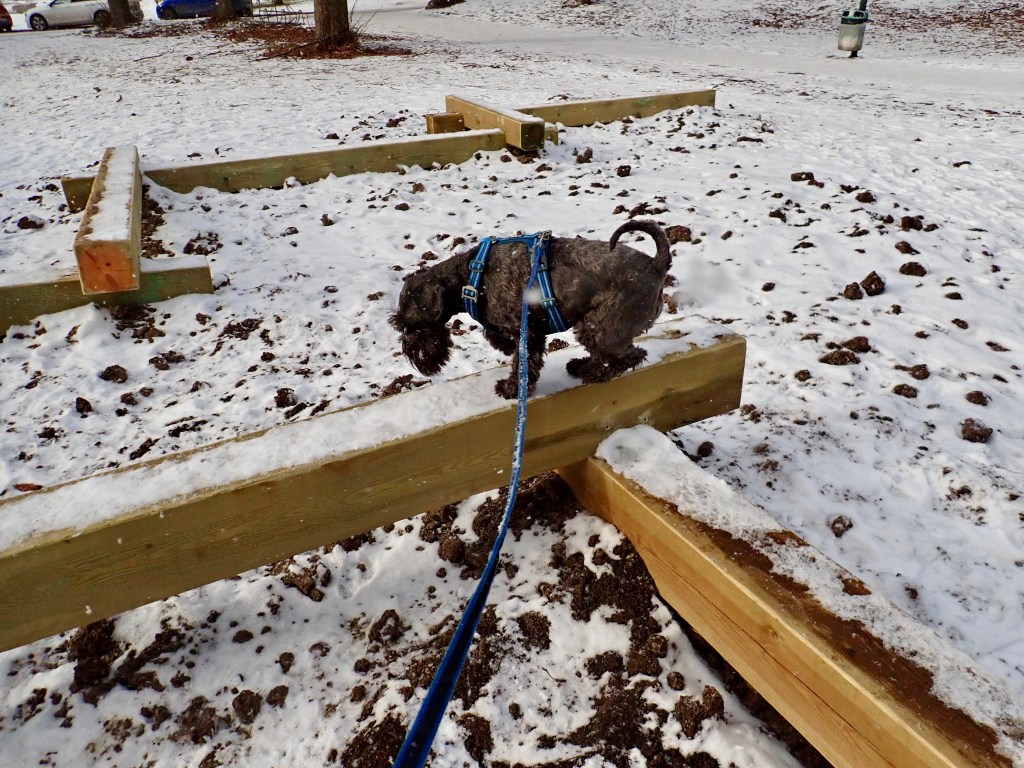 Utan att matte behövde uppmana honom hoppade han glatt upp för att undersöka den nya byggnationen.