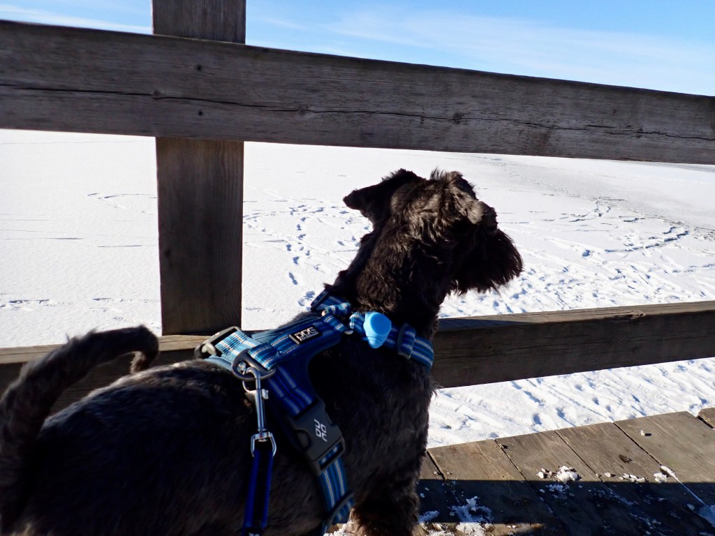Många är det som är ute och går på isen. Matte säger att det nästan är marsväder. Solen lyser och värmer lite .