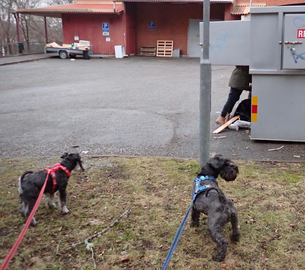 Bonk och brak…. Vi går runt containern för att kolla vad det är som låter. Aha en sopråtta på två ben.