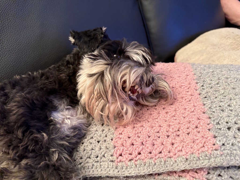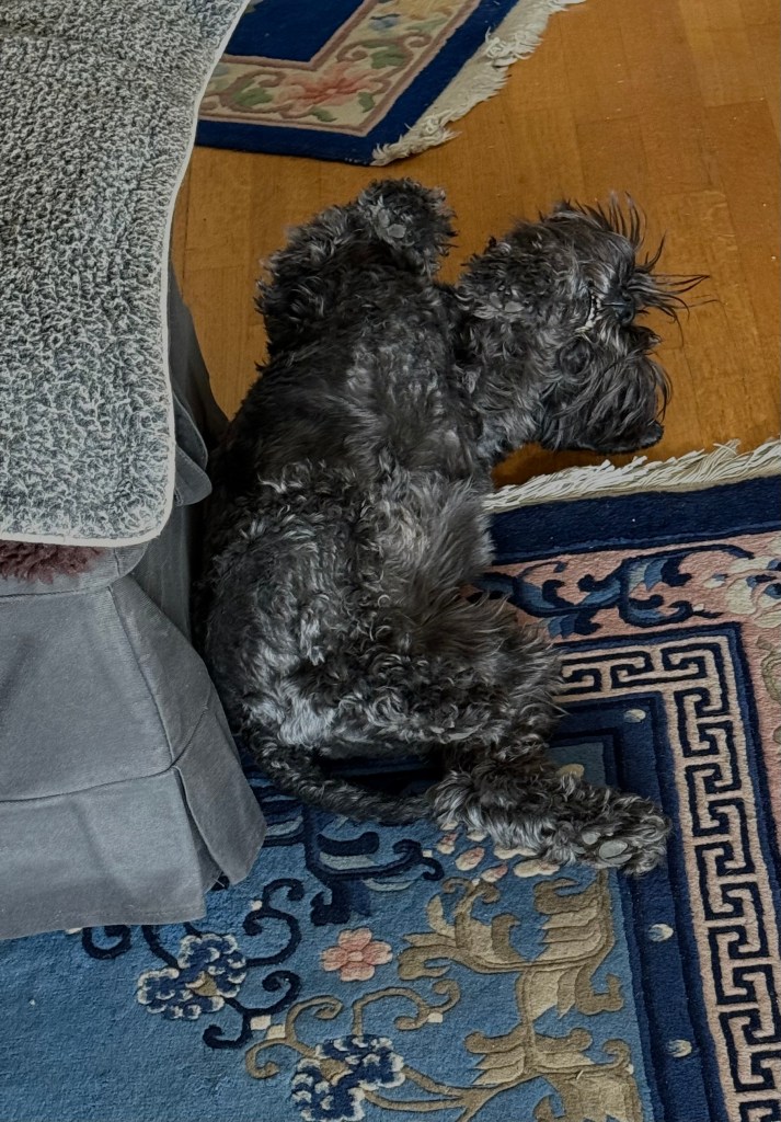 Tvåbeningarna löser Melodikrysset. Troy har intagit ryggläge och vilar lite innan det är dags att gå ut på långpromenad. Det hörs ett litet zzz