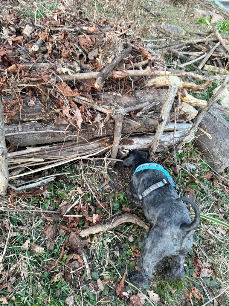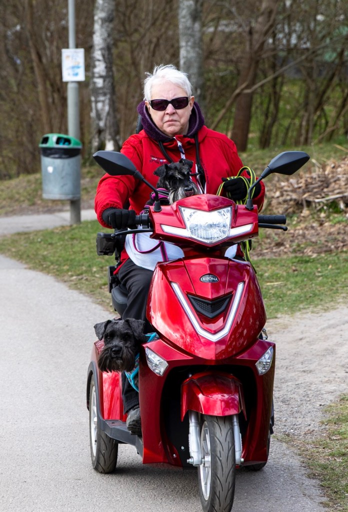 Ut på långpromenad. Vi tog vägen ner till Vinterviken och den slingan är cirka 4 km lång. Det var halvdant väder + 8 grader och lite blåst. När vi kom fram till bryggan som leder förbi badberget och båtklubben sa jag att nu vill jag åka med. Sagt och gjort jag tog plats i valpslingen. Under tiden son jag sätter mig tillrätta hoppar Troy utan någon förvaring upp på fotplattan. Va sa matte skall du också åka med. Han ställer sig så att när han lutar sig kan han se framåt. Vi åker hela bryggan och när vi är framme vid gångvägen frågar matte om han vill hoppa av och fortsätta gå. Men nähä da han sätter dig demonstrativ ned och gör ingen min av att hoppa av. Vi fortsätter och möter husse som påpassligt tog en bild på vårt ekipage.