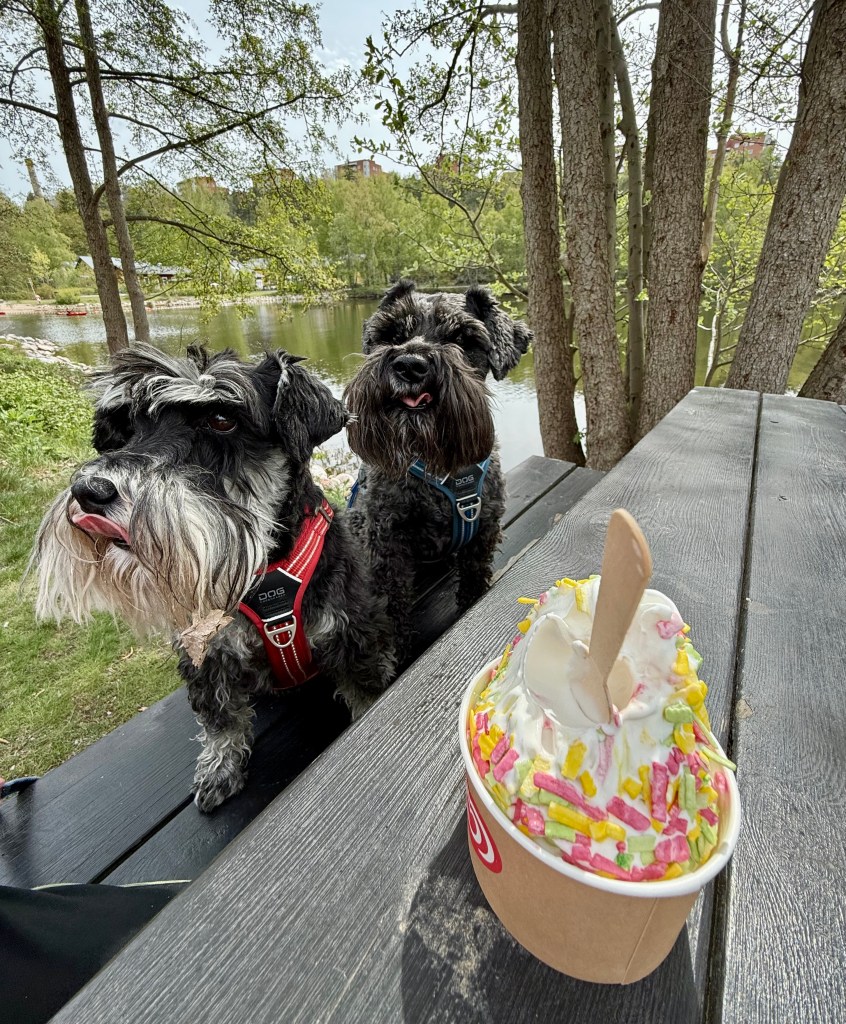 På vägen hem sa jag till matte att nu måste vi inviga nya glasskiosken med lite mjukglass. Mjukglass sa Troy. Vi fick smaka lite av matte som är liiite snål tycker jag, snål sa Troy.