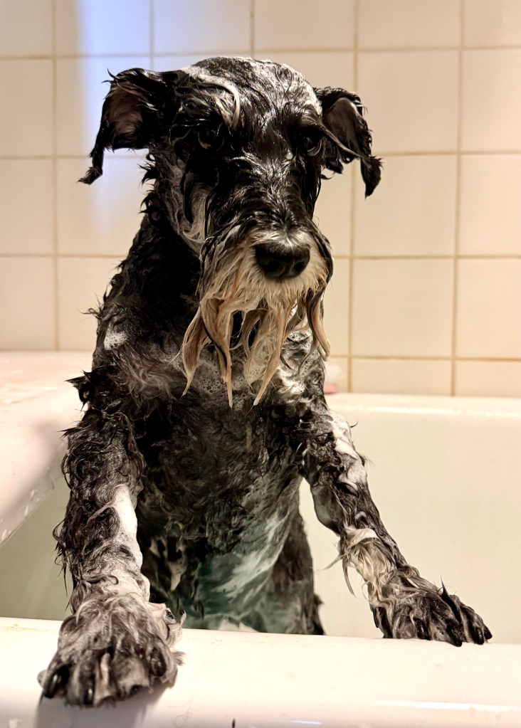 Nu är matte billig på blocket. Jag kan till och med lägga med lite av vårt godis. Här har man haft en härlig dag på Rävudden och så åker man på ett sådant där superäckligt schampobad! Tvi vale bara. Men det som oroar mer är att det förmodligen blir ett besök på klippbordet typ i morgon. På kvällspromenaden ska jag hitta på något bus som tack för badet.