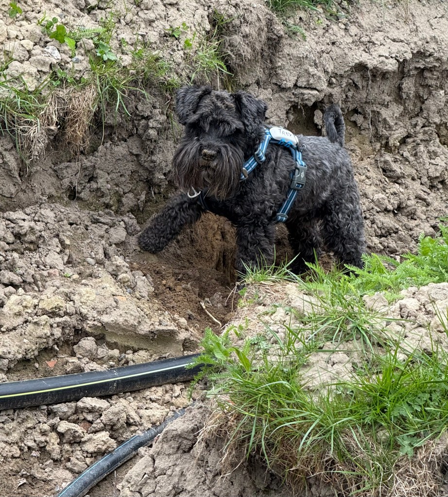 Hem till Tommy. Han håller på och drar in vatten till växthuset och har grävt ett spännande dike. Troy hade lite synpunkter på utförandet och grävde lite till. Troy mumlade matte missnöjt du är nybadad. OCH sa Troy, jag har ett viktigt uppdrag du vet ju att jag är förste byggkontrollant.