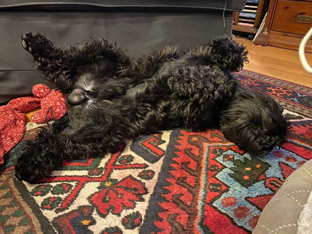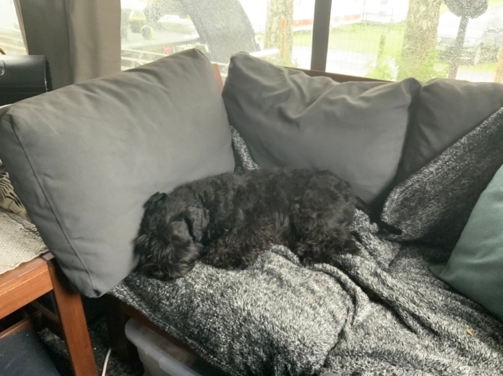 Nu ligger jag på favorit kudden och torkar efter fm. turen. Hoppas regnet går över tills det är dags för em turen.