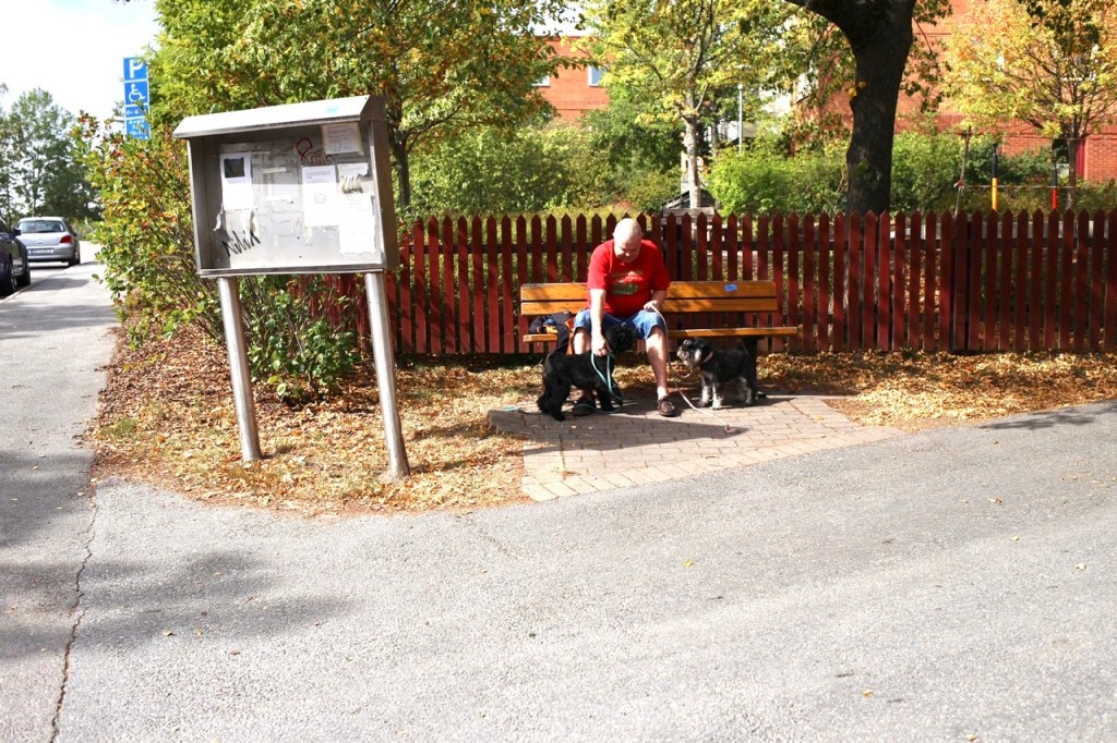 Husse gick på gångvägen tillbaka till bron. Vi gick igenom skogen men jag hade full koll på var han var hela tiden. Vi sprang lite före för att hinna ikapp honom och jag hittade honom direkt där han satt på en bänk och väntade på oss . Jag gillar inte att flocken delar på sig det blir så jobbigt att hålla koll på var alla är.
