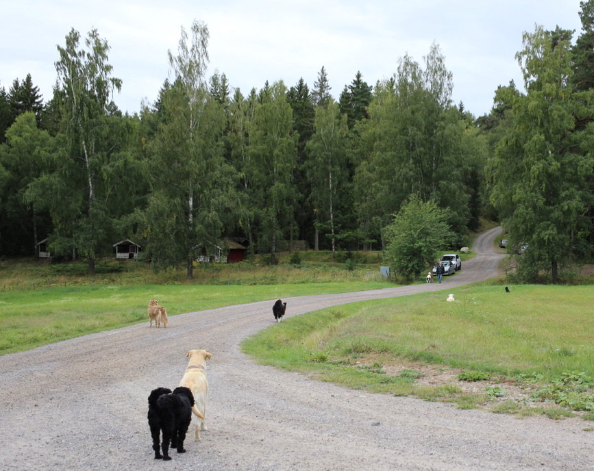 Äntligen är vi på väg och på fria tassar. Tvåbeningarna går och pratar med varandra men vi bryr oss inte i deras tråk vi har andra viktigare saker för oss.