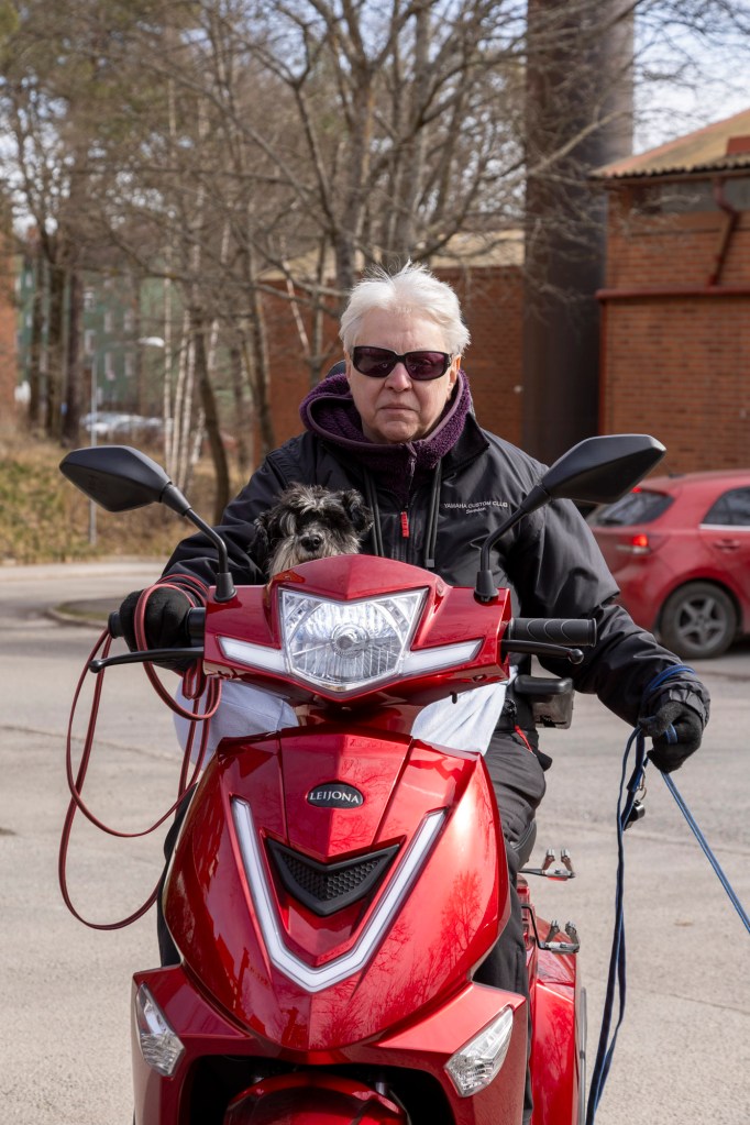 Härligt söndags väder! Vi har varit ute i flera timmar. Jag sa till matte att nu har jag gått tillräckligt så nu vill jag åka med. Hon hade hittat min gamla valpsling och den passade perfekt för en åktur på moppopeden. Jag sitter bekvämt nedstoppad i den och åkturen blir säker och bekväm.
