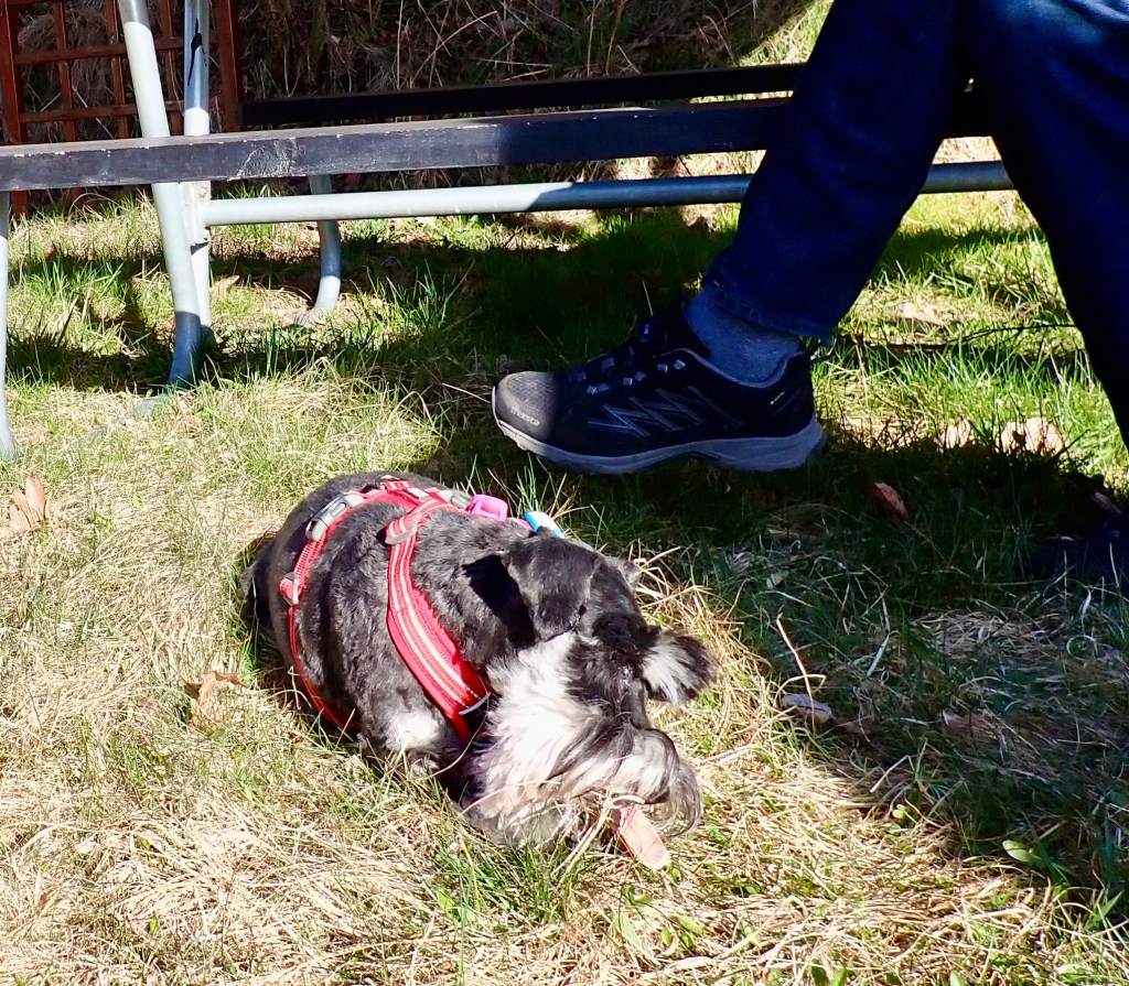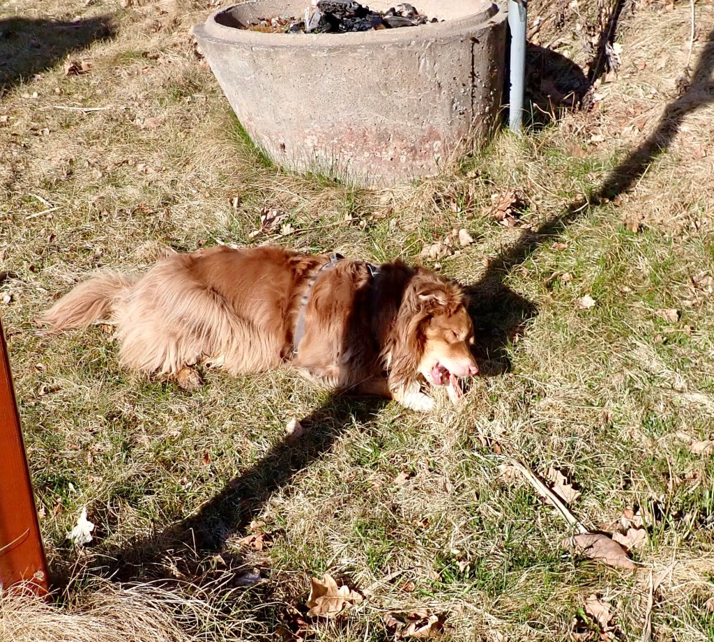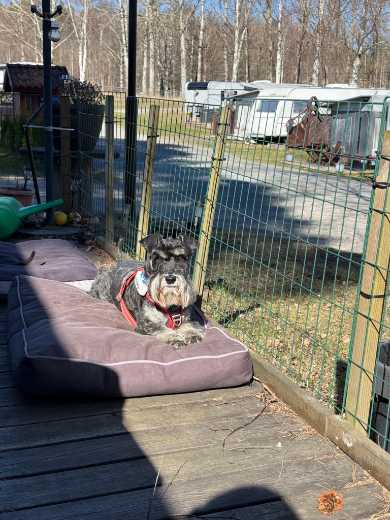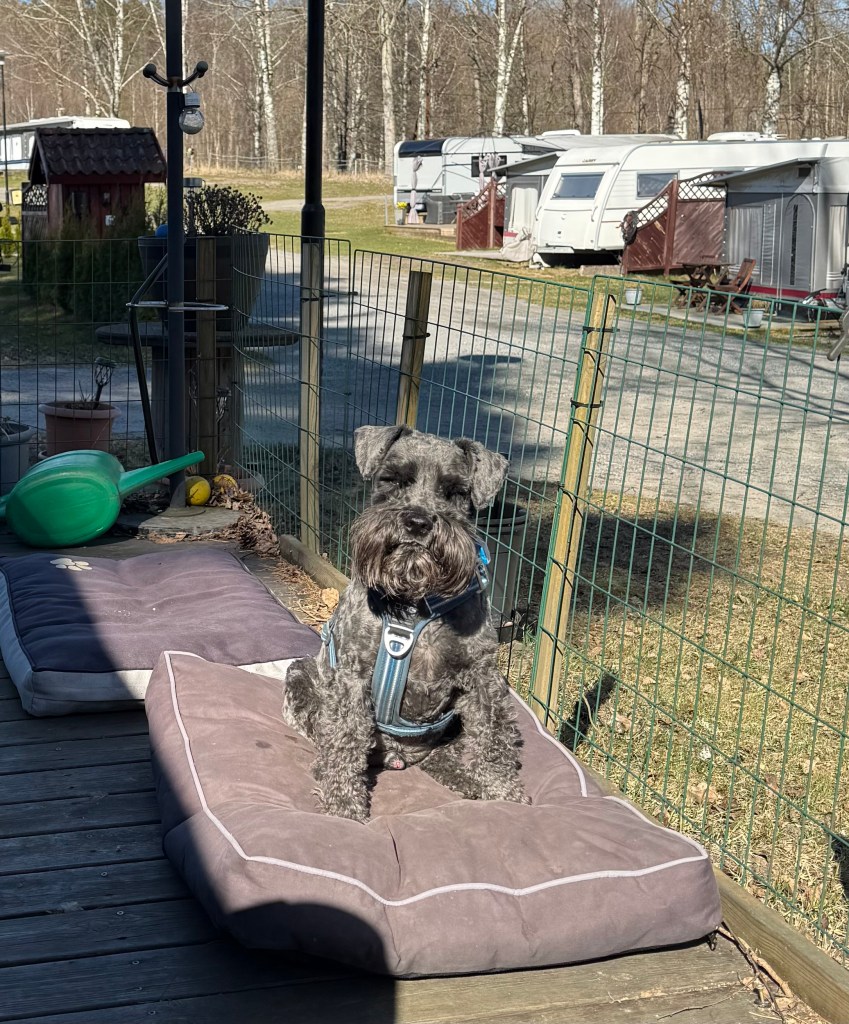 Troy njuter också i solskenet, han sitter och har ett litet knorrande läte av välmående. Det är vindstilla 19 g och solen värmer gott. Campingen håller så sakteliga att vakna ur vinterdvalan.