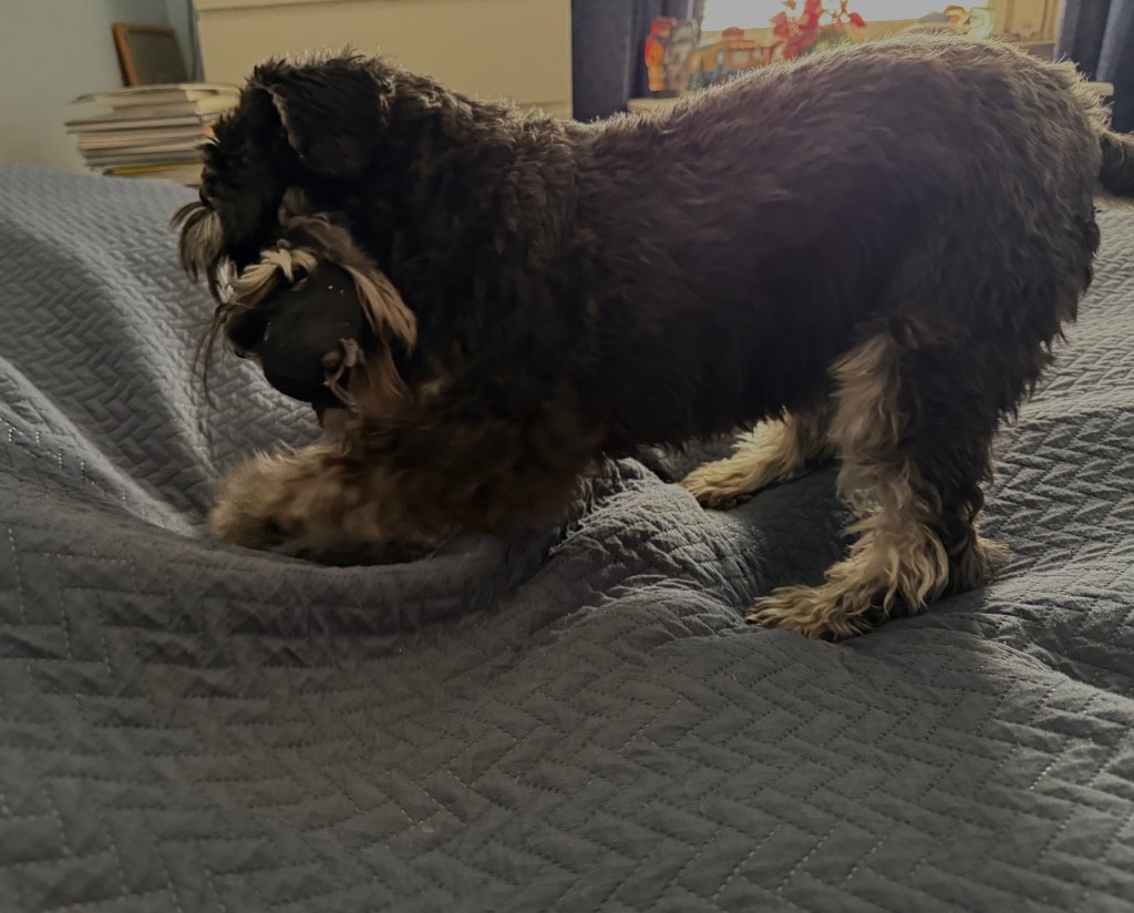 Matte kom hit! Vi måste gömma Råttis! Näe husse du kan inte sådant. Moha säger matte sluta gräva vi lägger honom under kudden istället.