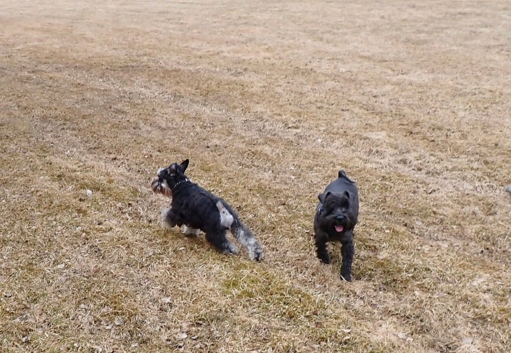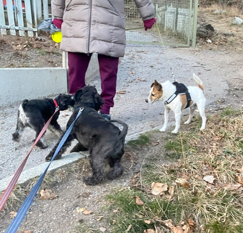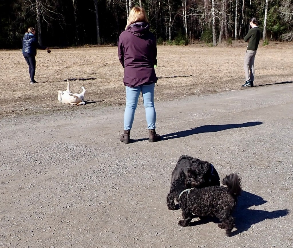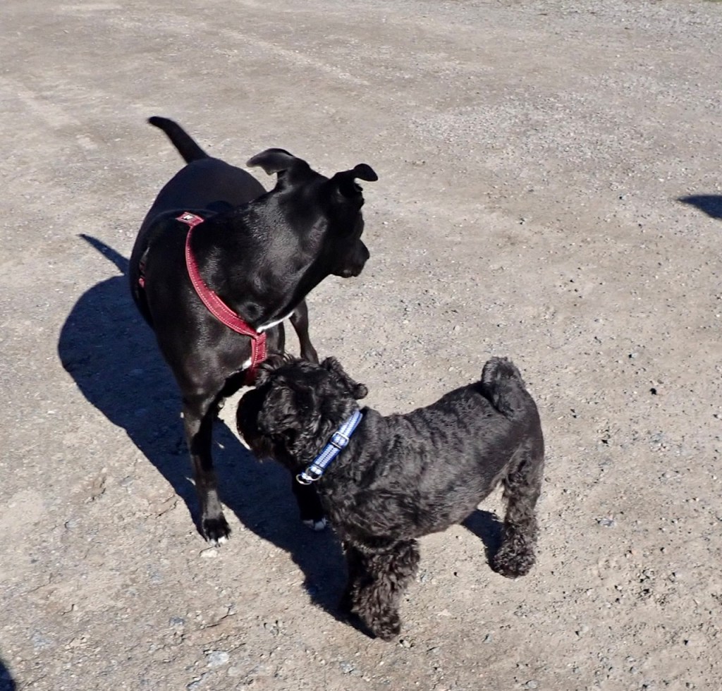 Troy och jag har lite avstämningar under promenaden bl.a. för att hålla rätt på matte. Sen springer vi iväg och minglar med de andra. Troy och lilla söta Luna hade en träff. Hon är väldigt lik mig t.o.m. matte tar fel på henne och mig en kort sekund