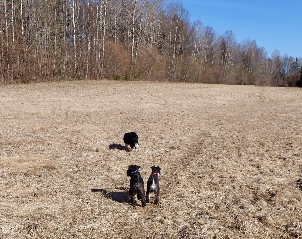 Vår härliga äng, solen skiner från en klarblå himmel och det är varmt i luften cirka 18 grader. Vi letar efter sork en stund sen har vi lite flockspring innan vi går vidare till skogen på andra sidan ängen.
