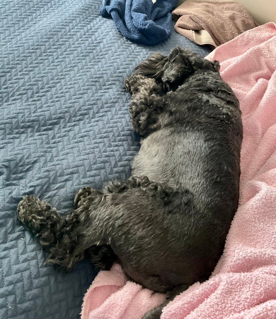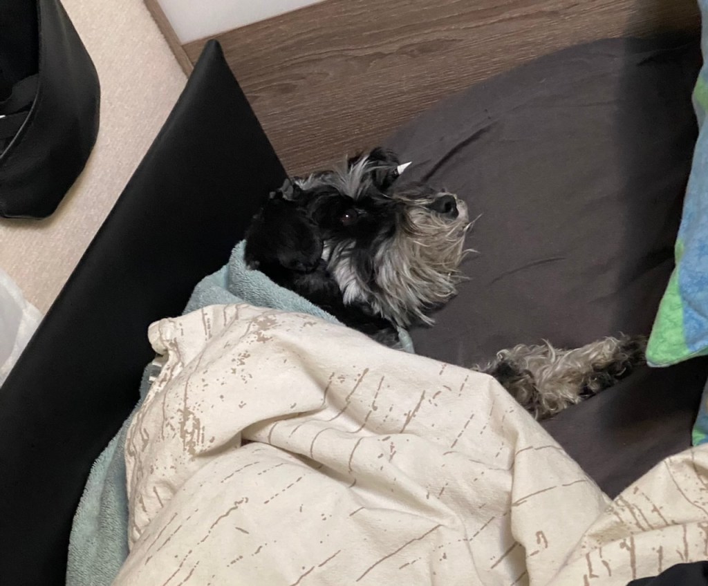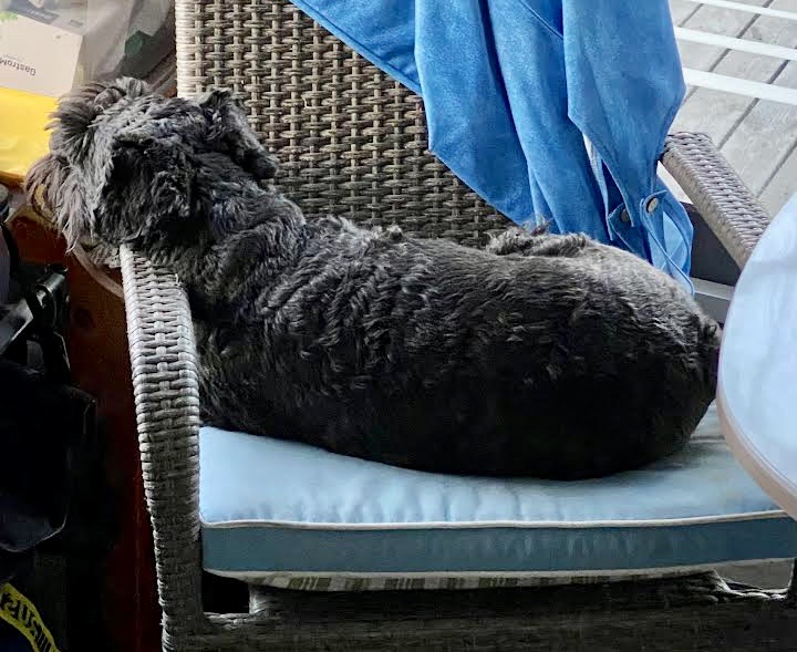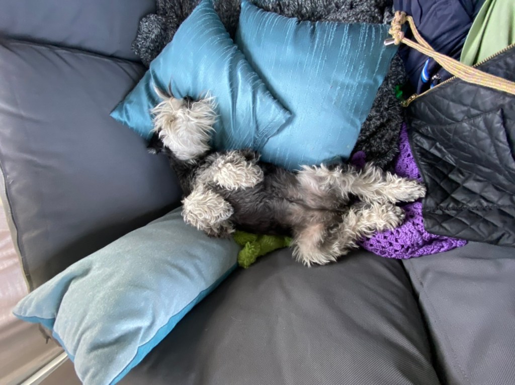 Hemma vid vagnen somnade vi och sov gott efter en härlig förmiddag. Troy sover med ett halvt vaktöga öppet. Det var mycket folk på campingen i det otroligt fina vädret så det var mycket att hålla koll på.