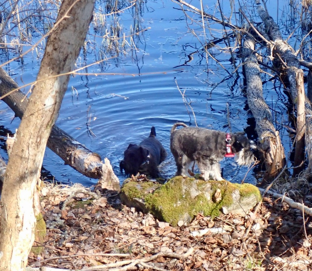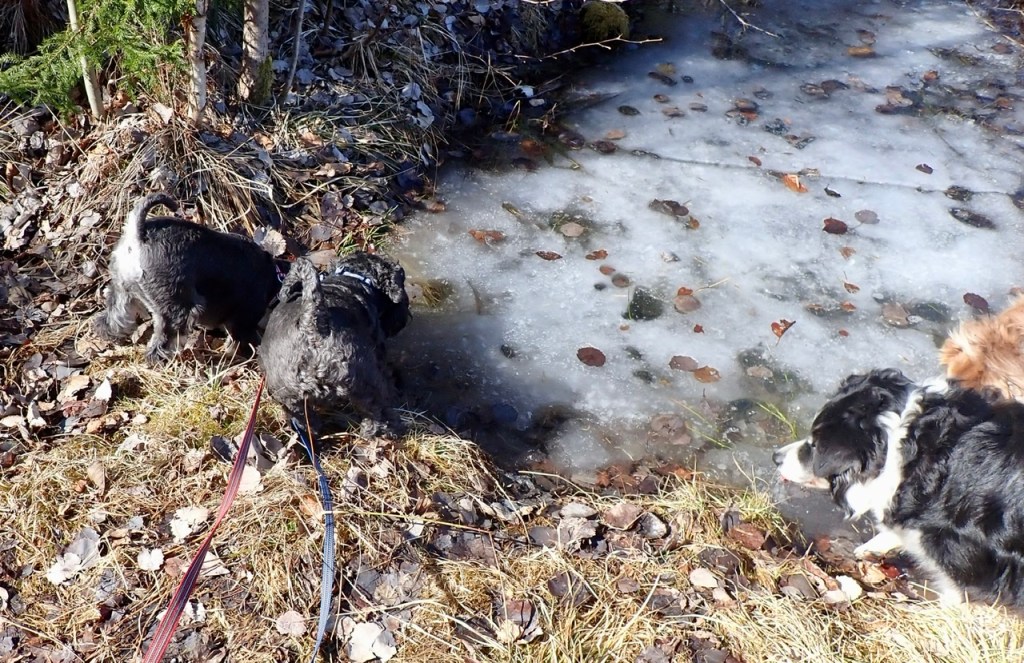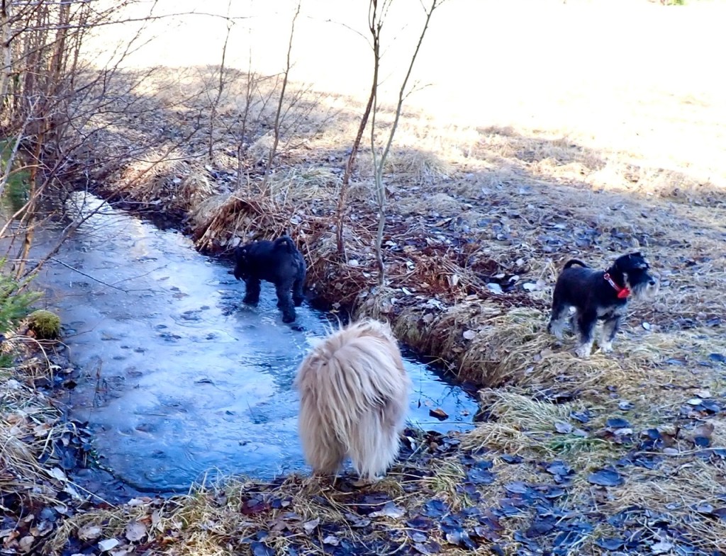 Wow det är fullt av vatten i vårt lerdike. Det ligger lite i skuggan så diket täcks av lite is. Basse trampar igenom för att få tag på lite dricksvatten. Troy går ut på isen och matte säger akta dig du kommer trampa igenom. Han fortsätter gå och mycket riktig brister isen och han sjunker ned lite men med ett jätteskutt kommer han upp på fast mark.