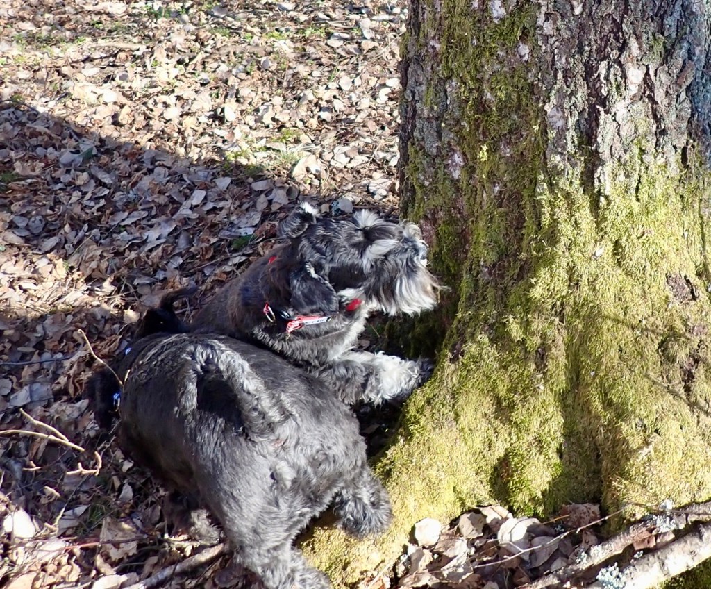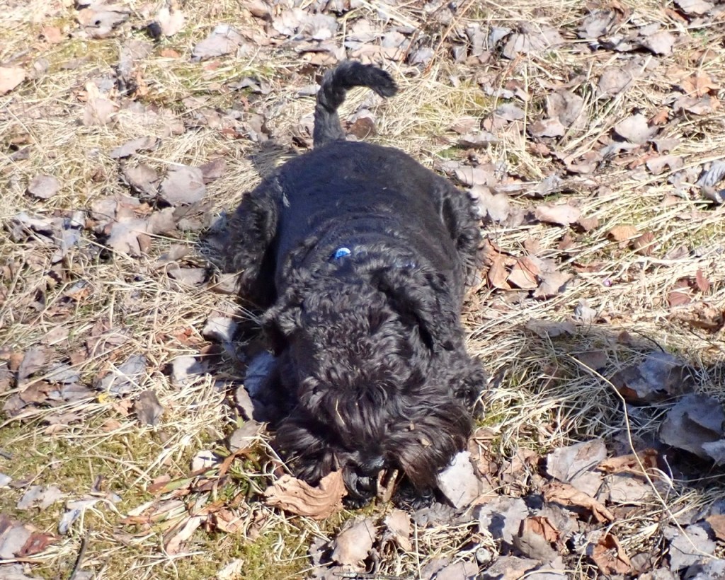 Troy tar glatt över revbenet och vill stanna en stund för att gnaga lite på det. När han gjort det ett litet tag gick han lite avsides och gömde det tills vi kommer tillbaka. Alla hundskogar borde ha lite ben gömda här och där.