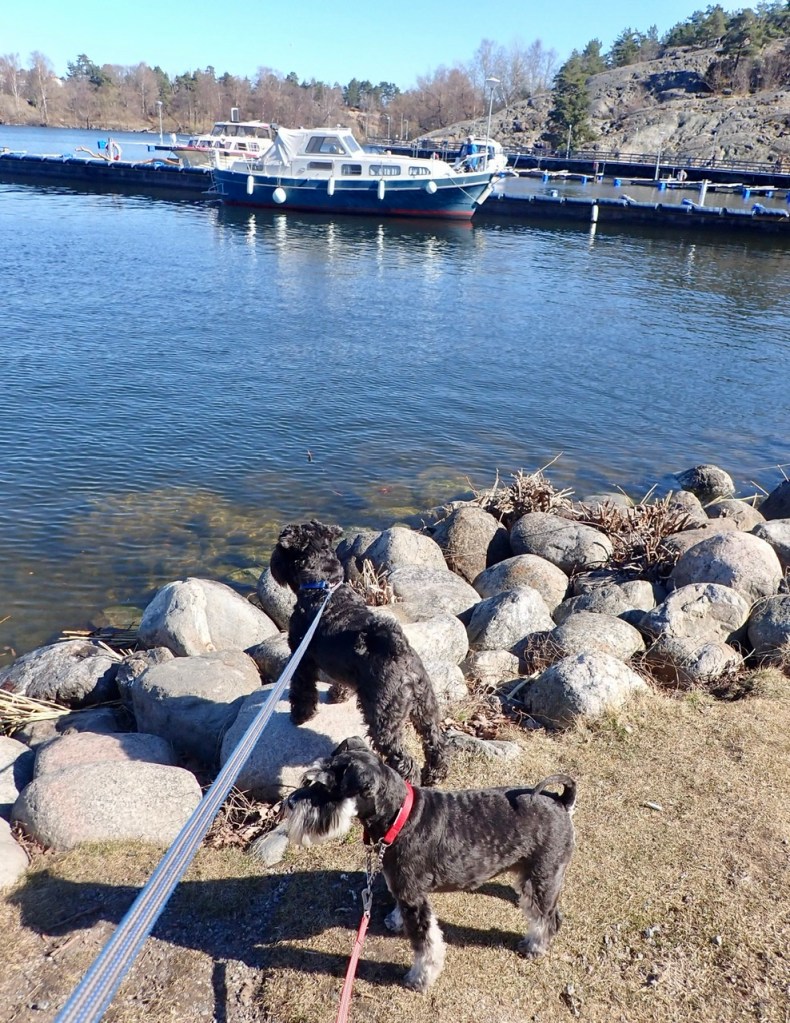 Nere vid båtklubben är det full aktivitet det är stor sjösättning i helgen. Några höll på och satte i sina båtar lite tidigare. Vi tyckte det var lite spännande att titta på dem som rörde sig på bryggorna.